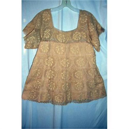 Lovely hand crochet lace bands sewn together to make a peasant style blouse, or at least that is what they were called in the late 40's, early 50's. These were very popular in ElPaso,Tex. where I lived. worn with a broomstick skirt, and sandals or moccasins. WOW! This blouse is almost brown in color, very mellow, the closer I got with the camera, the lighter it got. The blouse measures 20 inches from neck to hem, and 40 inches around the bust, underarm to underarm, the bottom of the blouse, around the hips is 50 inches, the sleeve inseam is 6 inches, the blouse is lined with silk tafeta. No labels, obviously hand made. In near mint condition, no stains, no holes. Thanks for Shopping in the Land of Enchantment!
