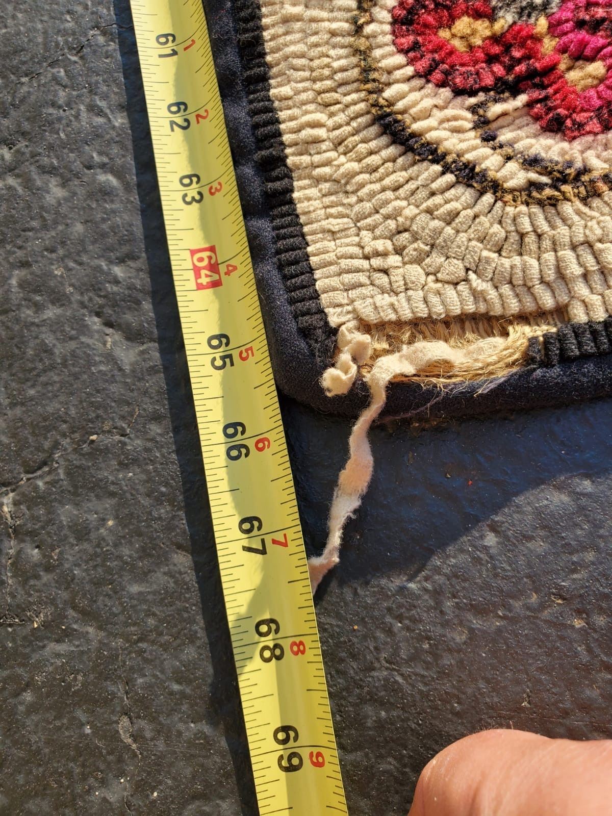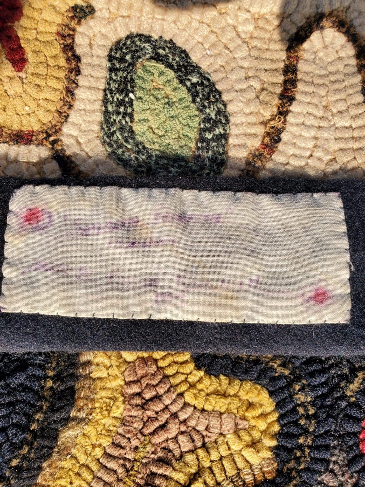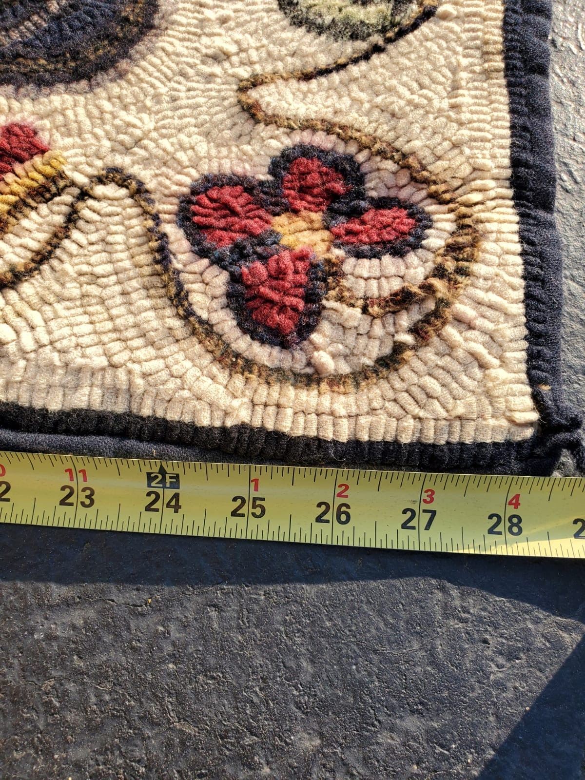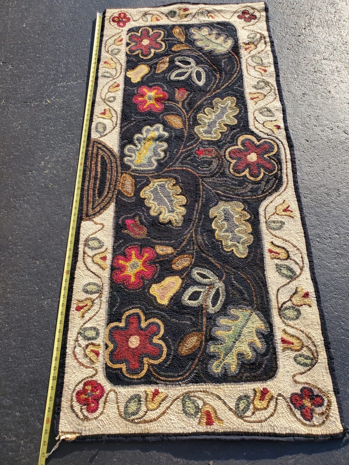 Vintage hand hooked runner with leaves and flowers, dated and signed on back. Measures approx. 66 inches long and 28 inches wide.
