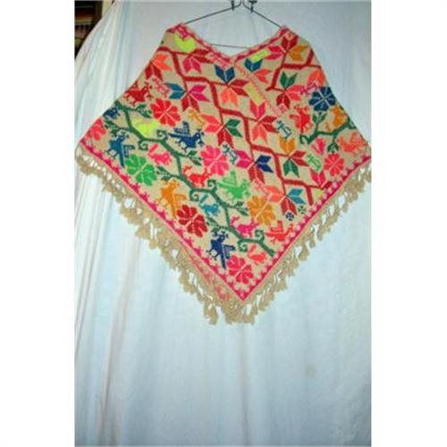 Very colorfull, hand made, hand embroidered, Mexican poncho. Measures 27 inches, from neck to hem, the neck opening is 30 inches, and the length around the bottom is 100 inches. Tree of Life design, all in cross stitch, birds, flowers, vines etc. Thanks for shopping in the land of Enchantment!