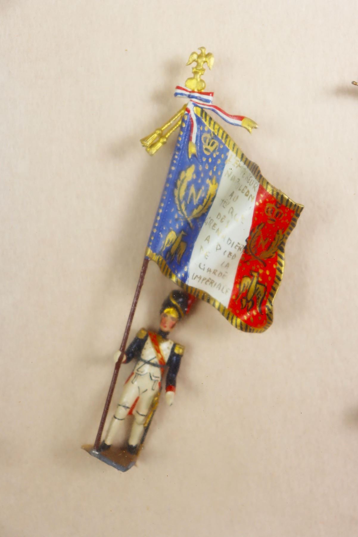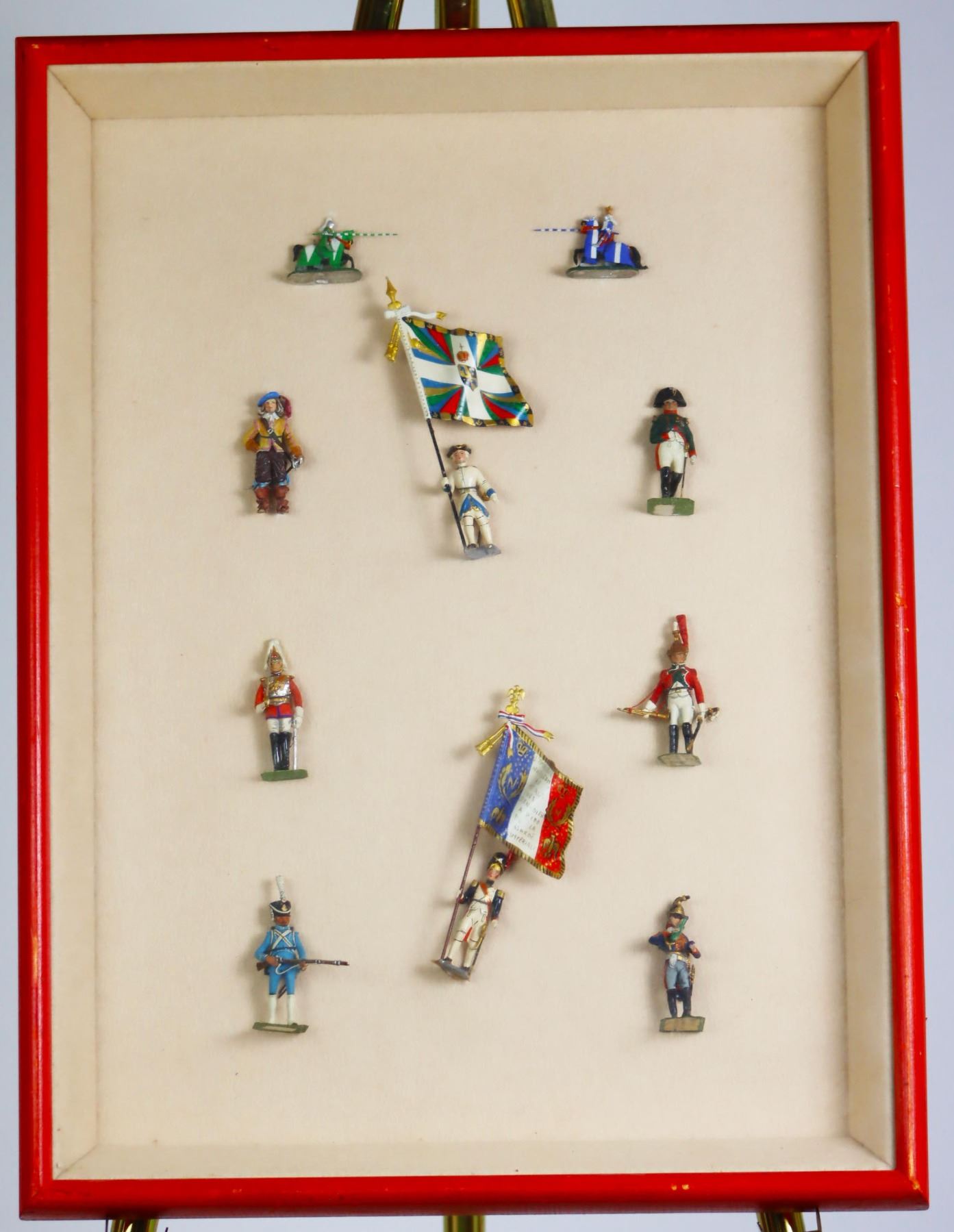 French and English Handpainted pewter soldiers, mounted and framed under glass.