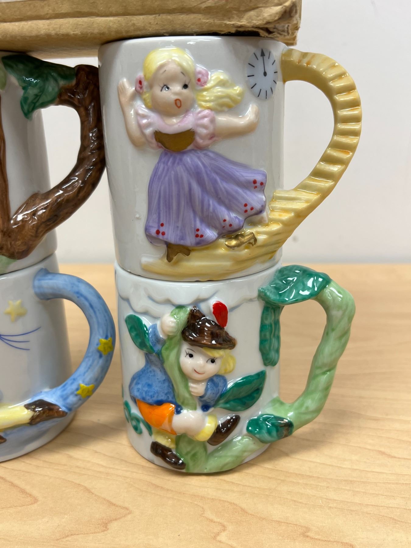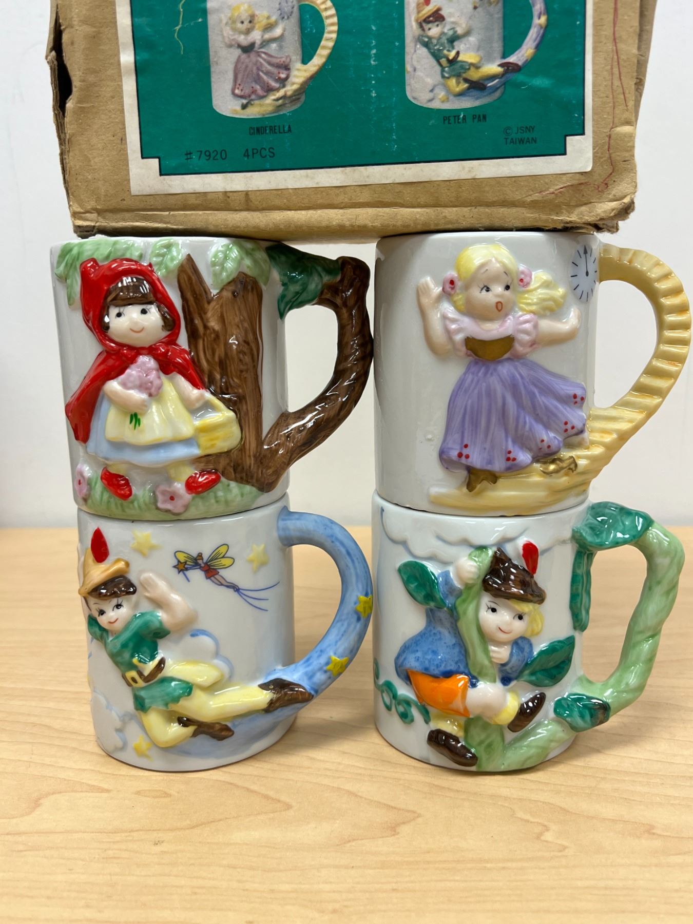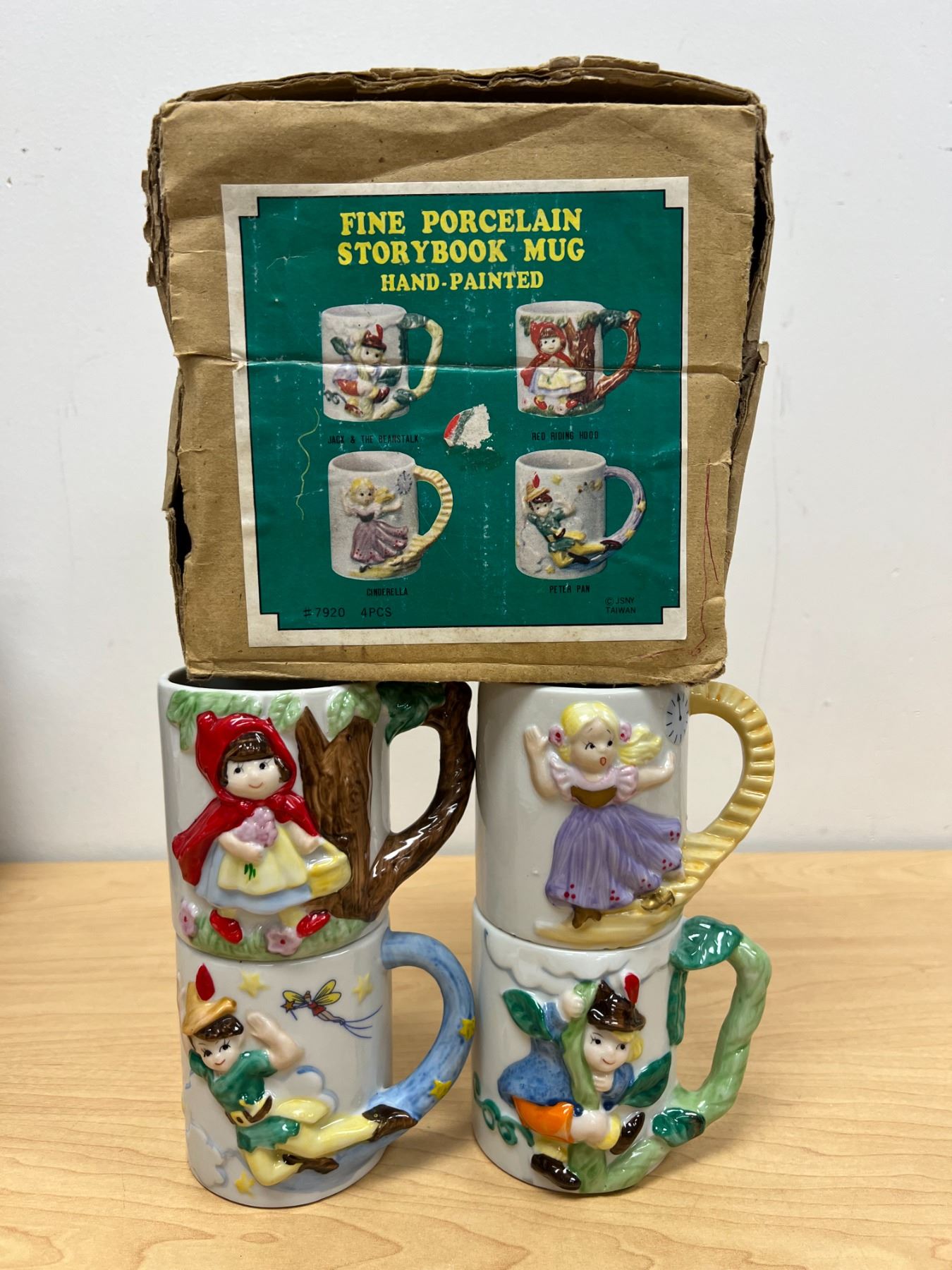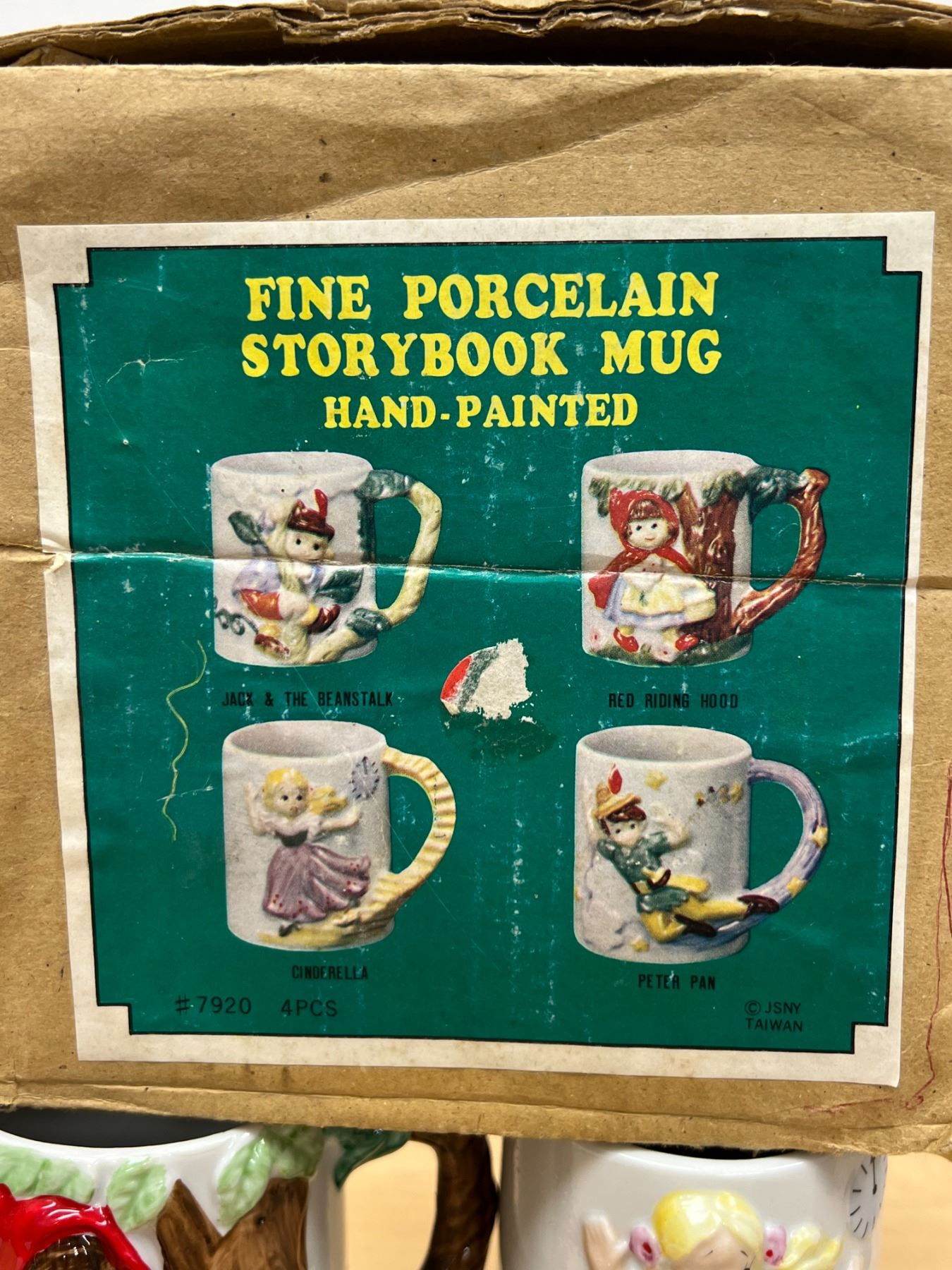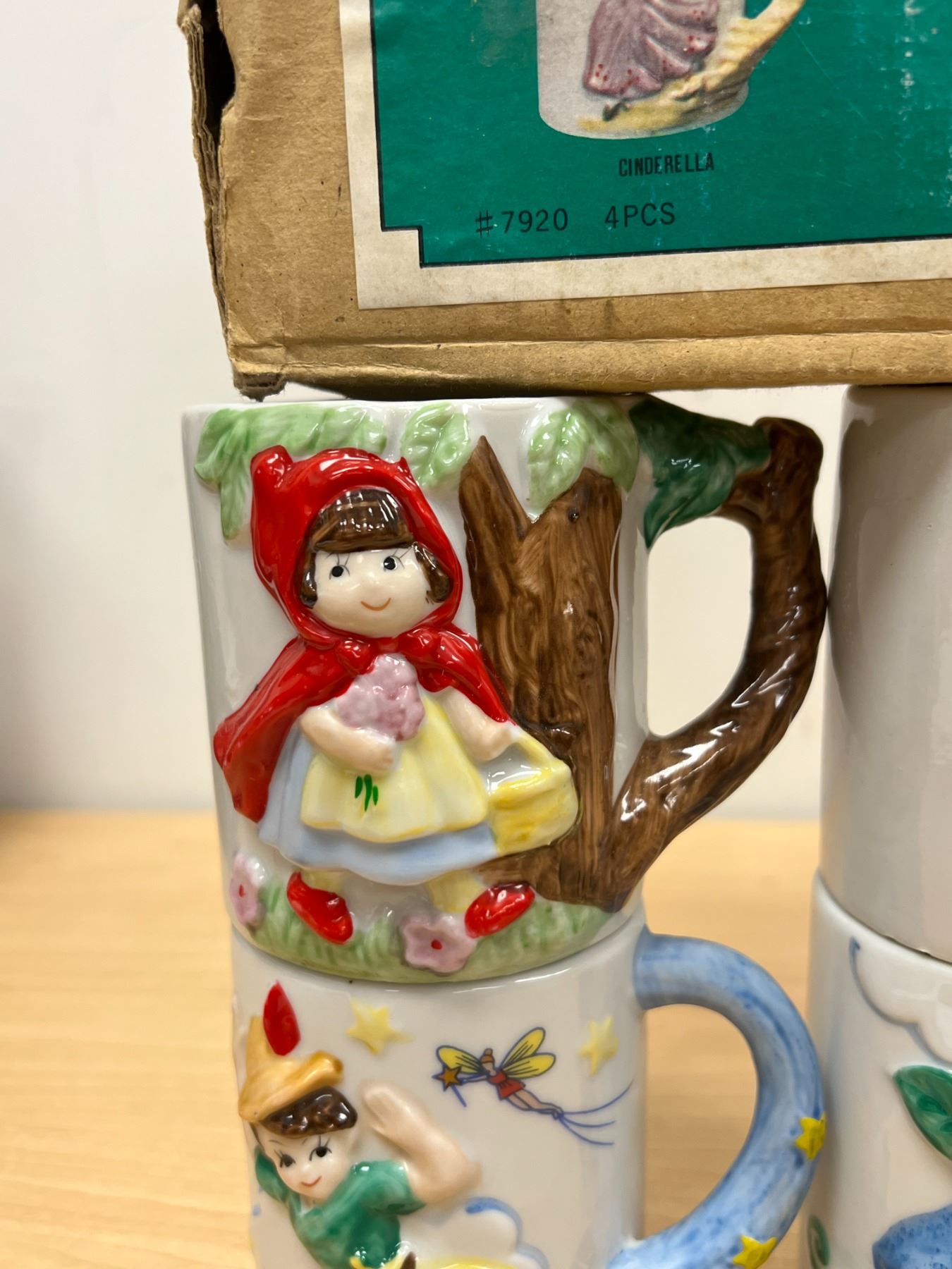 Vintage Hand Painted Porcelain Storybook Mugs in Original Box - Cinderella / Peter Pan / Red Riding Hood / Jack & The beanstalk