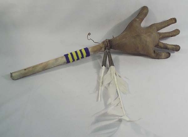 Vintage Hand Rattle With Beading. Leather hand with leather on the handle and bead work. The feather has some damage, one feather missing. Measures approx. 17'' x 5 3/4''W.