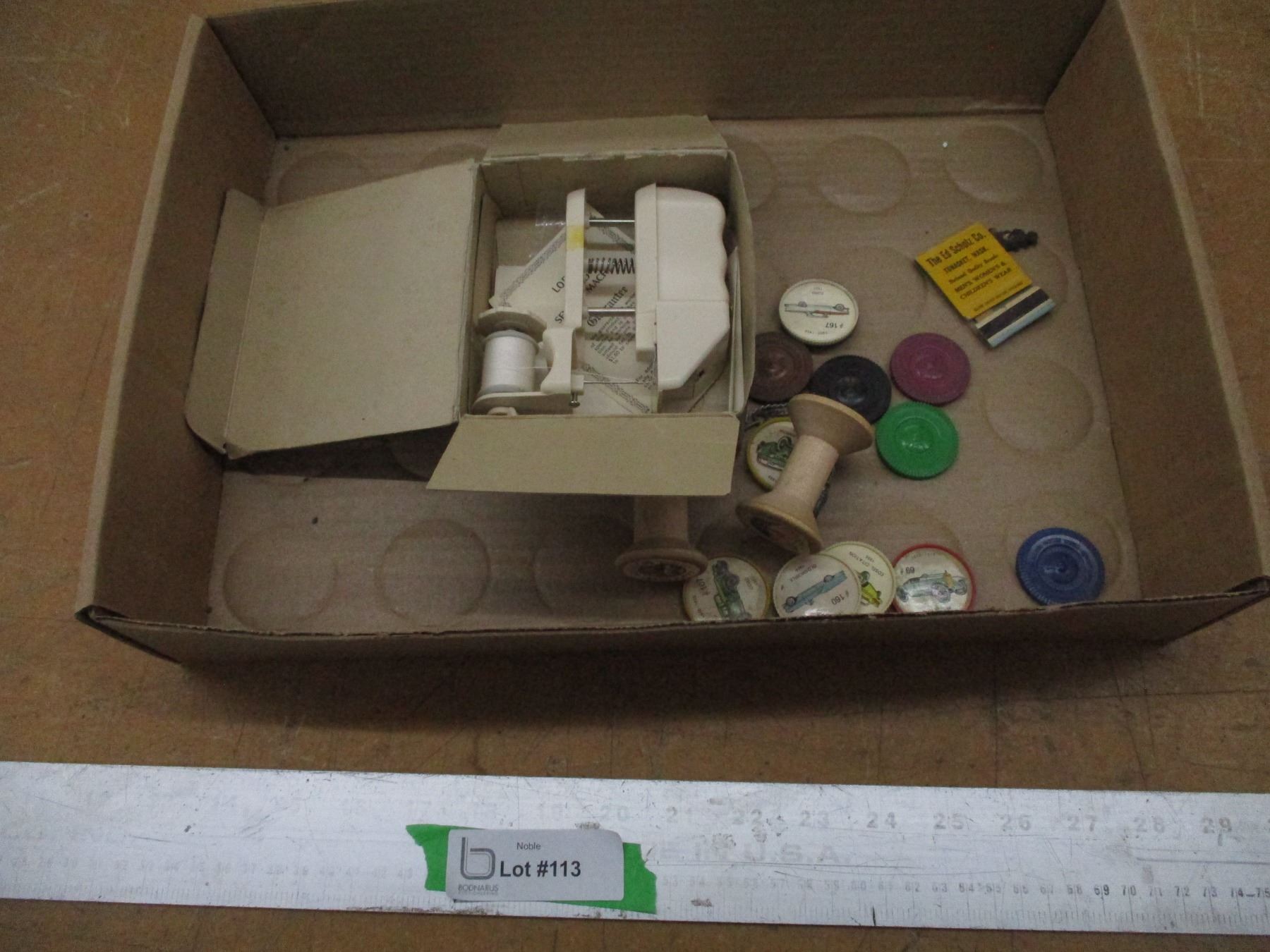 Vintage Hand Sewing Machine, (12) Jello Collector Wheels, (2) Wooden Thread Bobbins & Avon Car Charm Bracelet