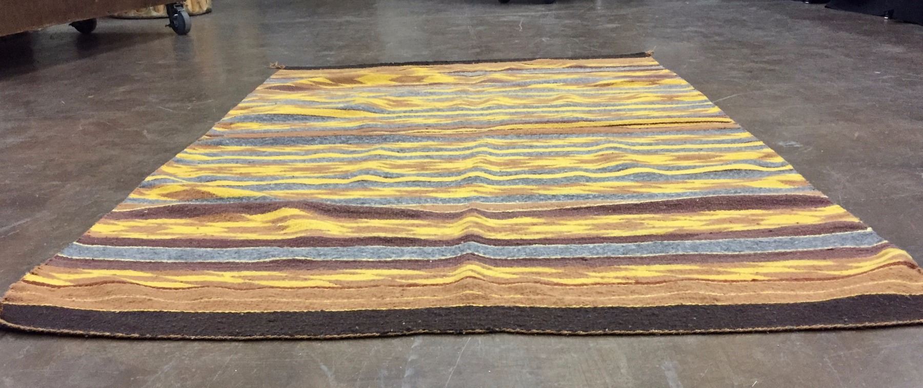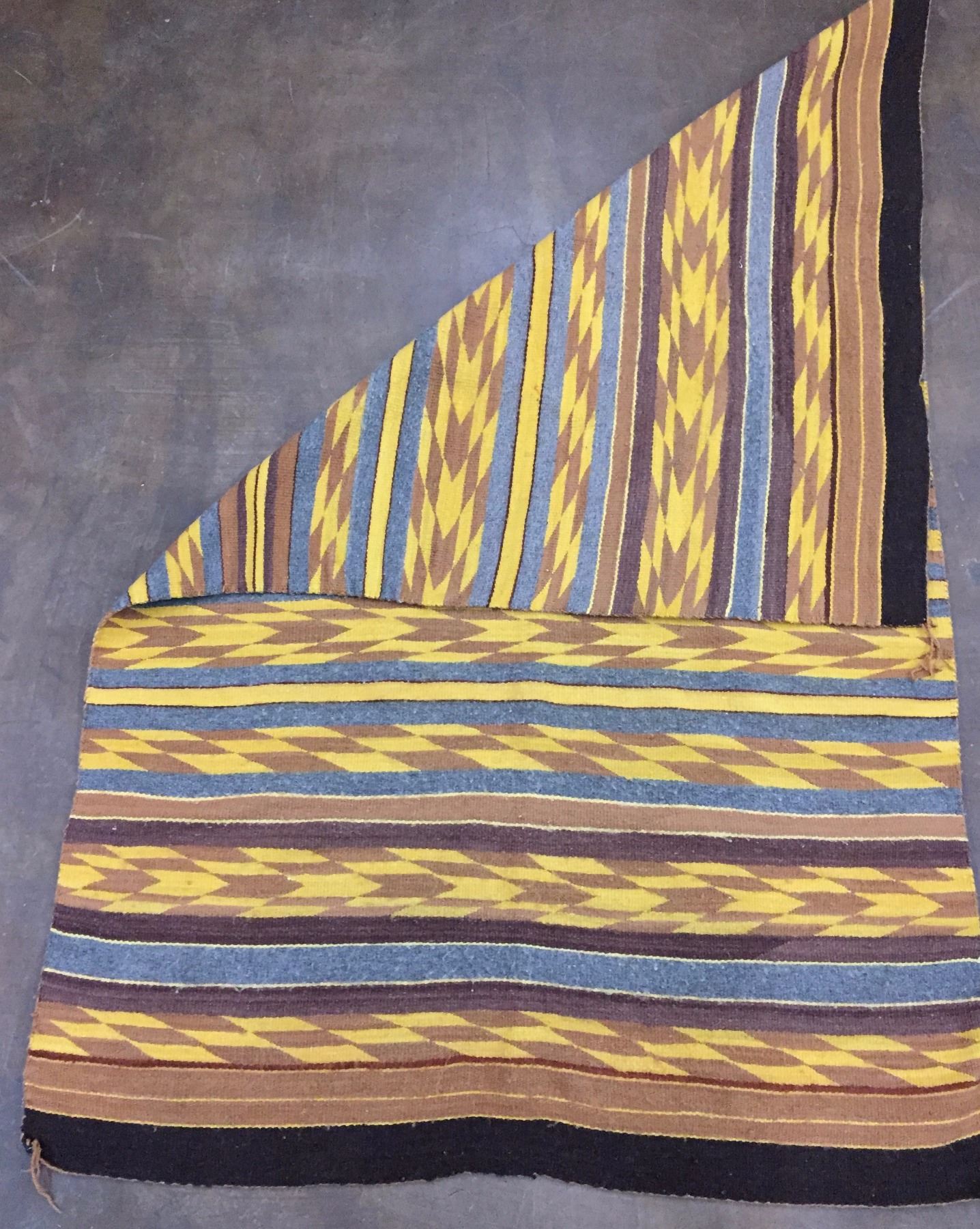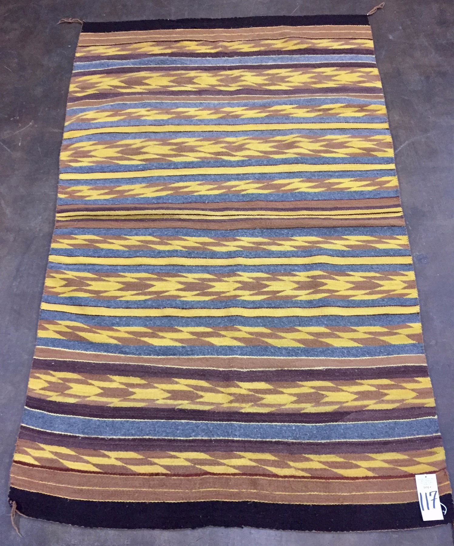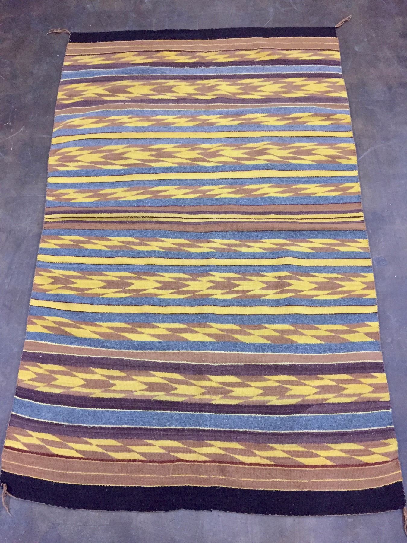 Maker: Unknown Navajo weaver. Approx. Age: Vintage. Size: Measures 44 1/2” w x 72 1/2” l. Additional Info: A vintage Navajo textile with hand spun wool. Condition: Good for it’s age, normal wear expected. Please look closely at the pictures - they are an important part of our description. Shipping: There will be a $8 handling / packaging fee for shipping this lot. The actual cost of postage will be added on top of that.