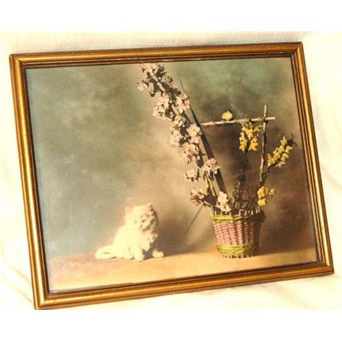 Hand tinted photo of a white kitten near a old basket of flowers.   This hand tinting was popular when only black and white film was avail.   Few people had the skill to bring them to color by hand tinting.  Now it is lost art.     The condition of this one is excellent. It comes in a old brass painted wooded 10" x 8" frame behind glass.