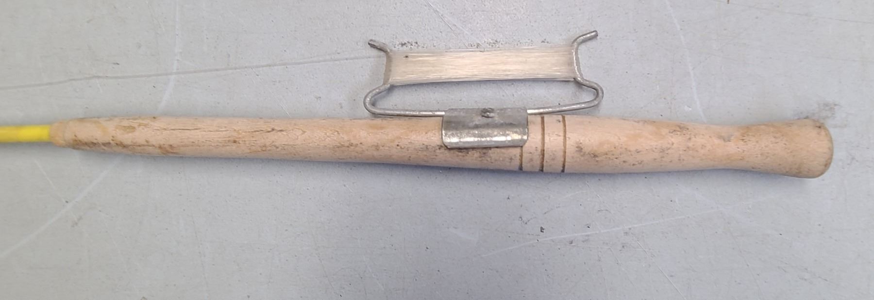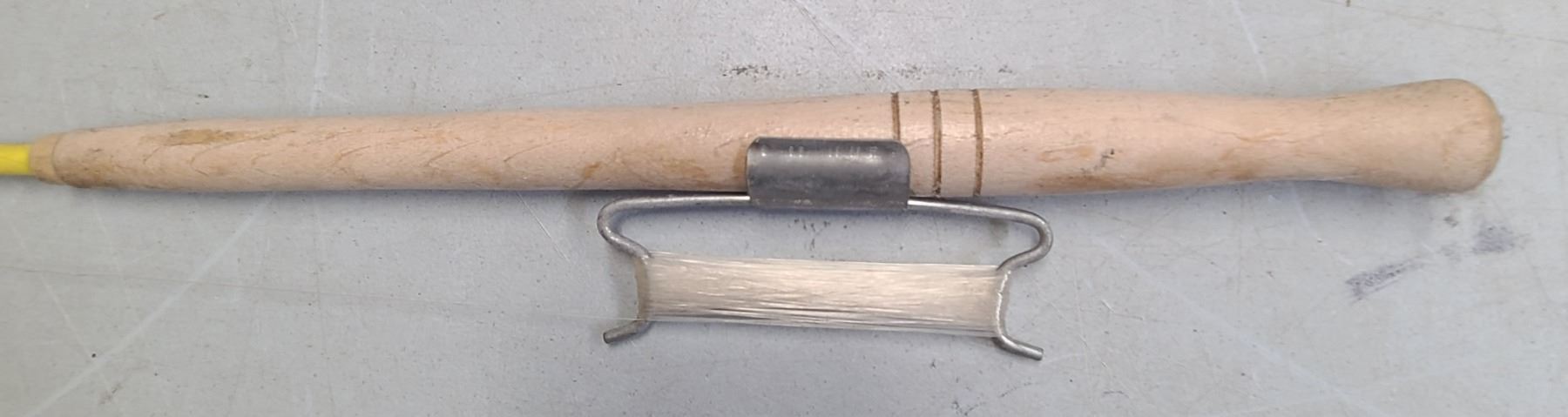 Attached to handle is a metal bracket which is used to wind the fishing line onto by hnd.