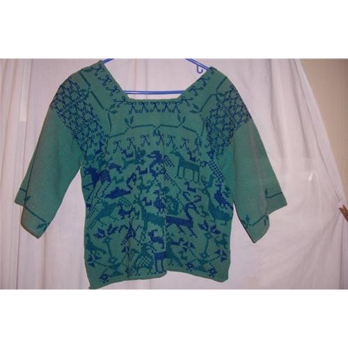 Beautifull hand woven, hand embroidred with cross stitch, Wool top, silk tafeta lining, Turquoise color, small size, measures 18 inches from neck to hem,(waist length), 40 inches around the bust, underarm to underarm, and the sleeve inseam is 10 inches, the measurement at waist is same as the bust, made to have a boxy shape. Great for jeans, skirts, etc. Good condition, no holes, or loss of embroidery. Thanks for shopping in the Land of Enchantment!