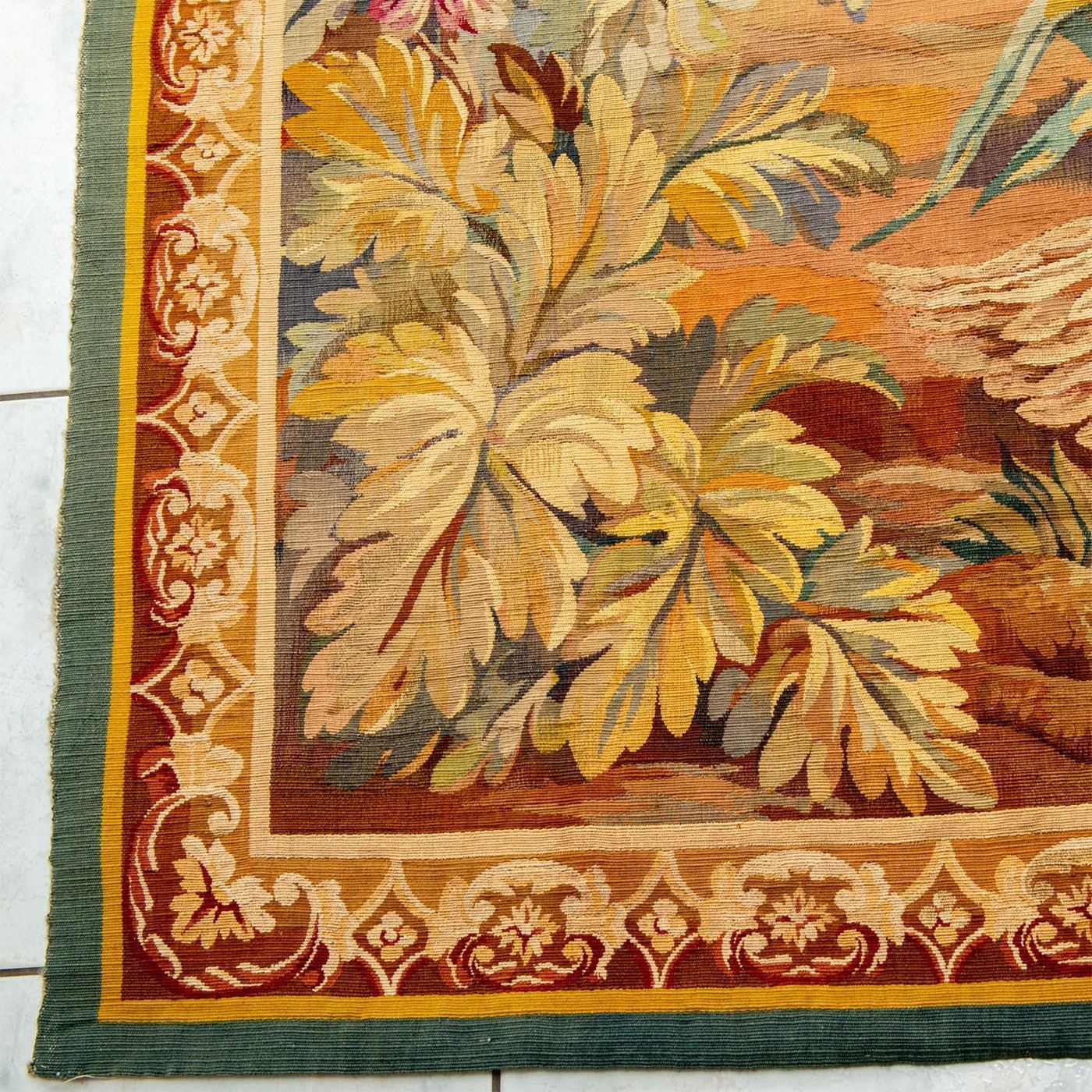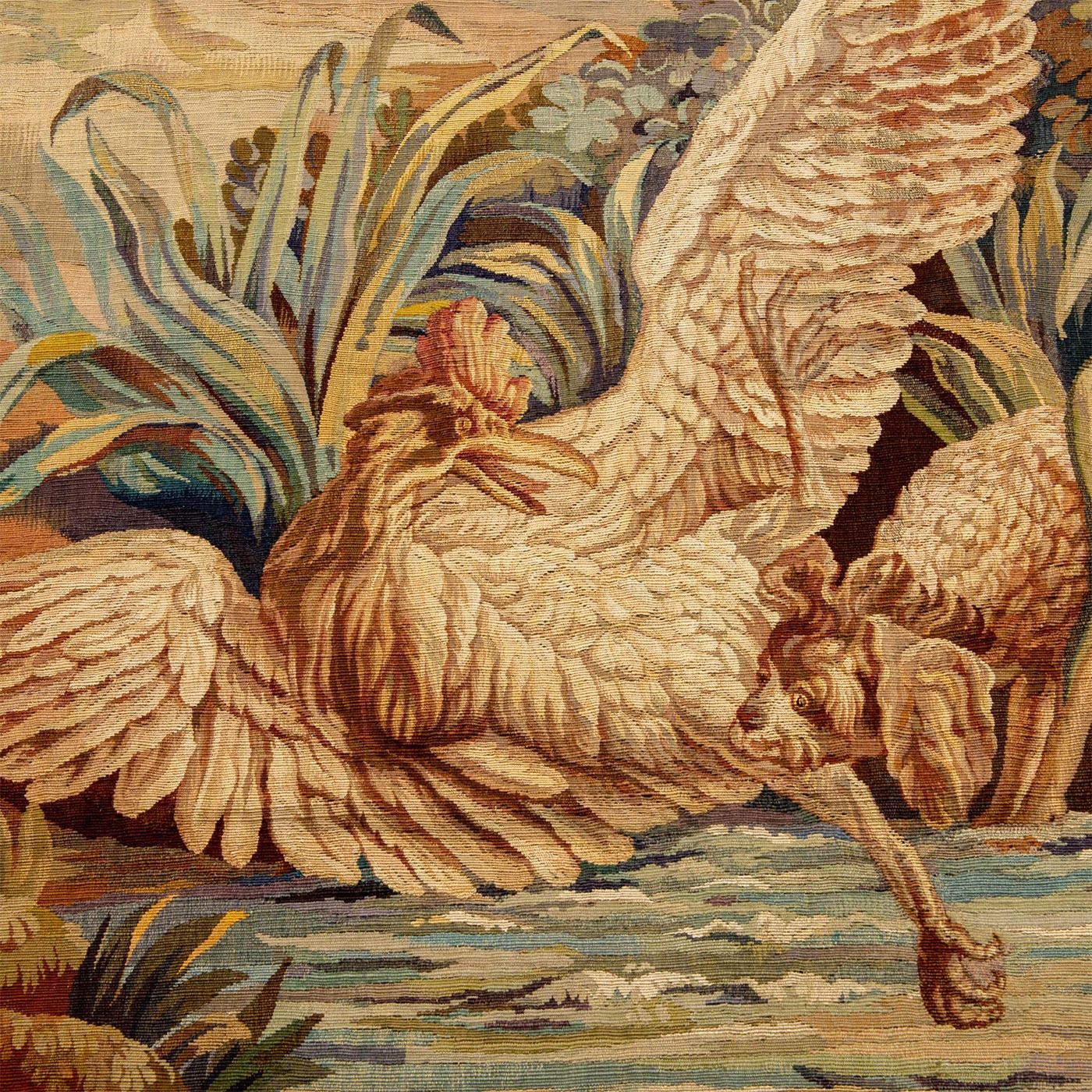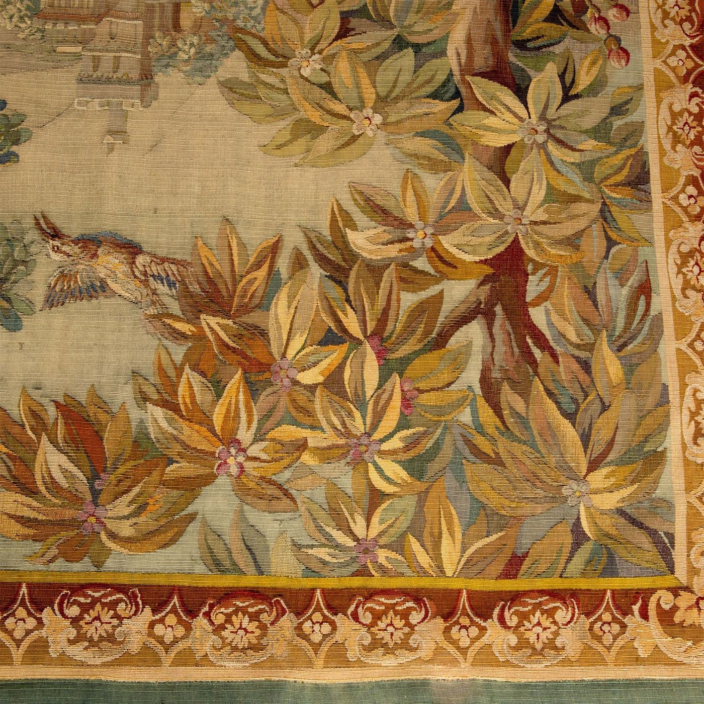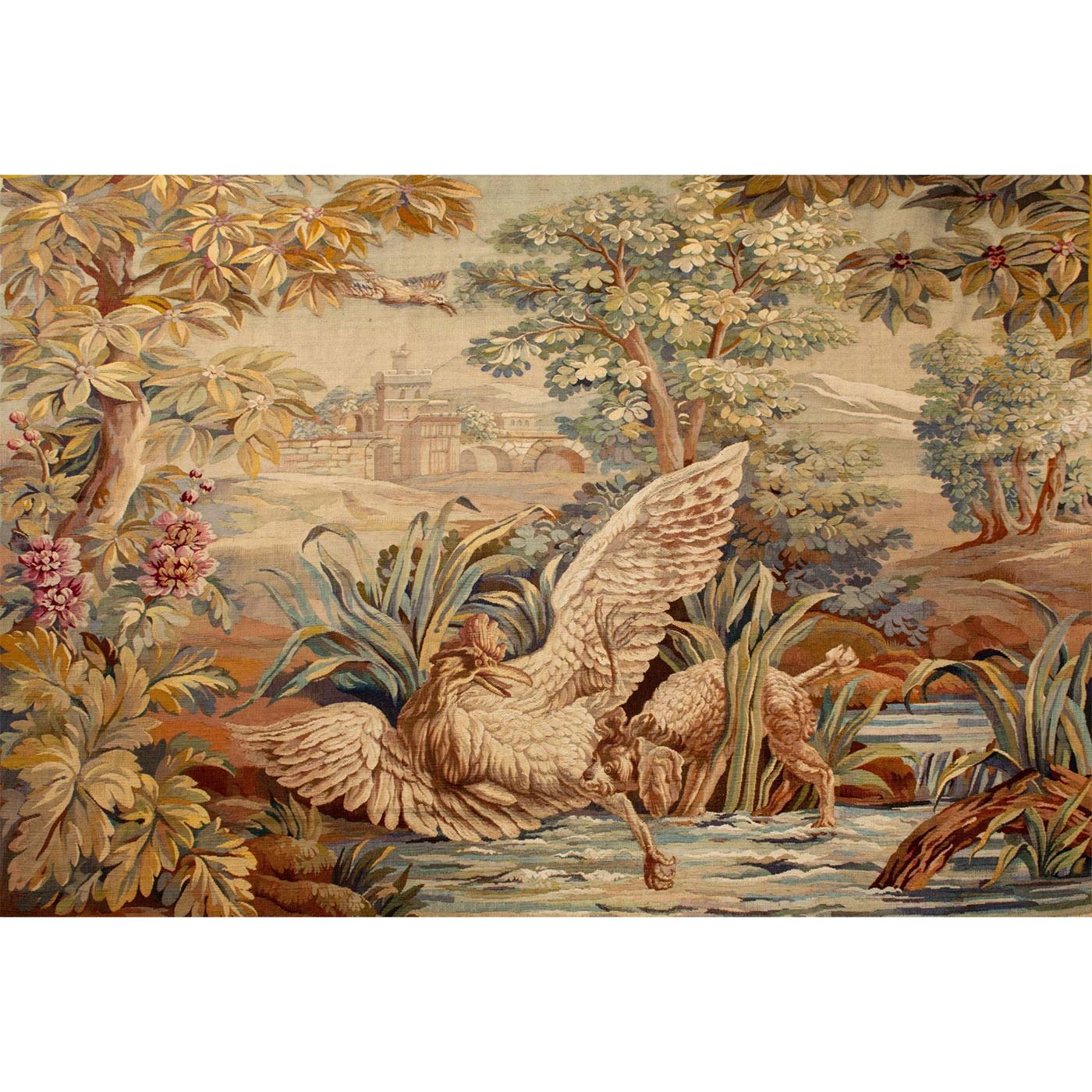 Impressive, handmade tapestry style woven piece with stunning scenes of lush forested area. The lush, green composition features a rooster and dog along a river stream in the foreground and a castle pictured in the background. Depicts a variety of trees and foliage. The scene is framed by a foliage patterned border. Age and use related wear; re-stitched border.