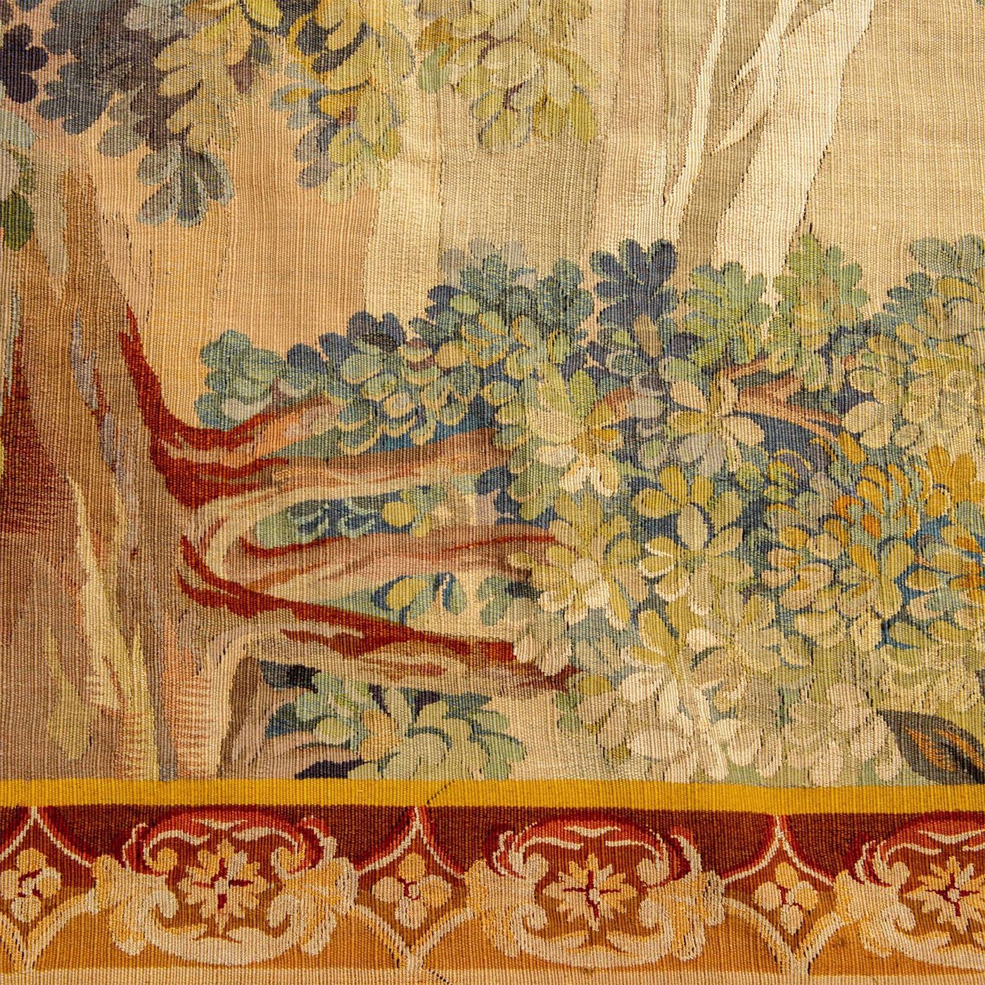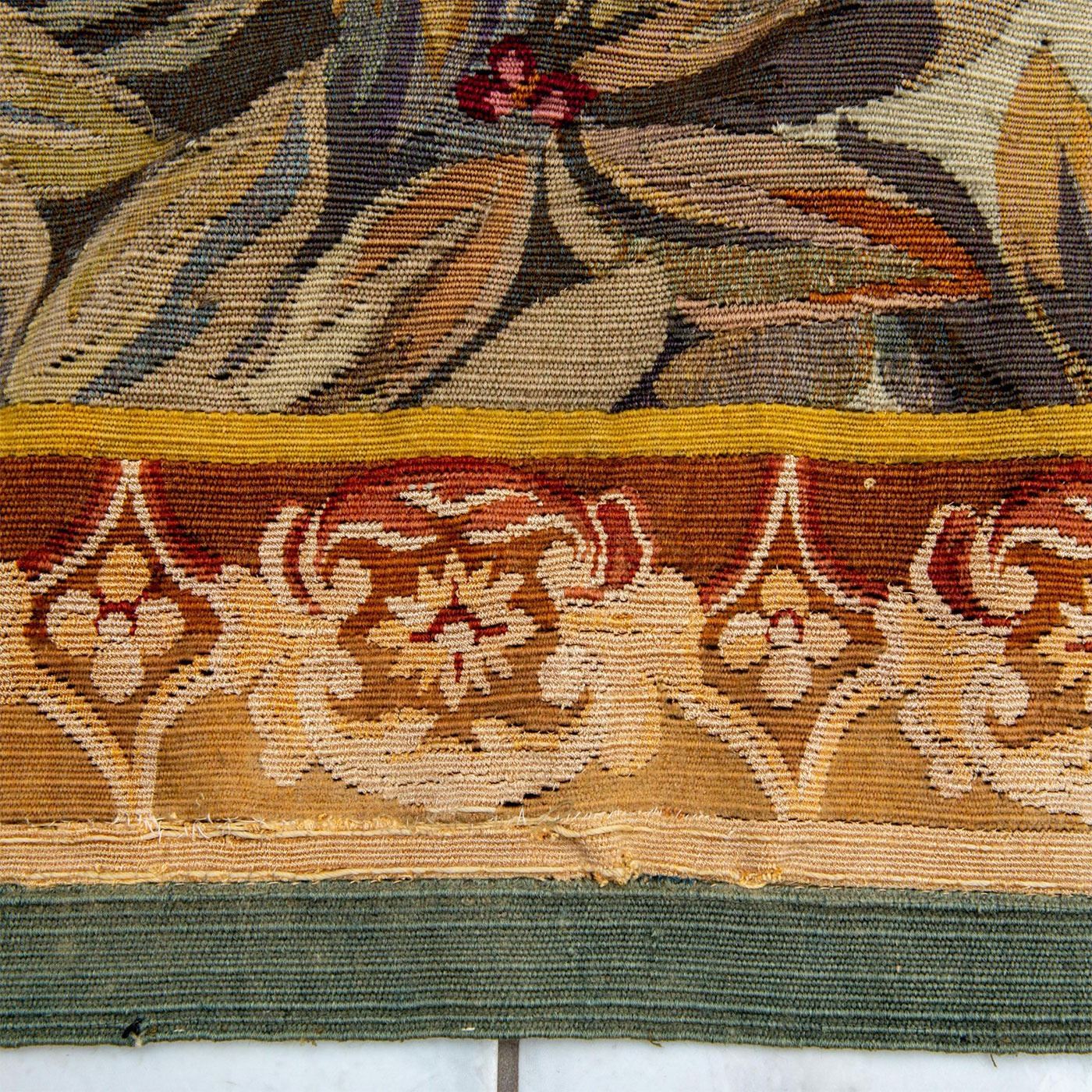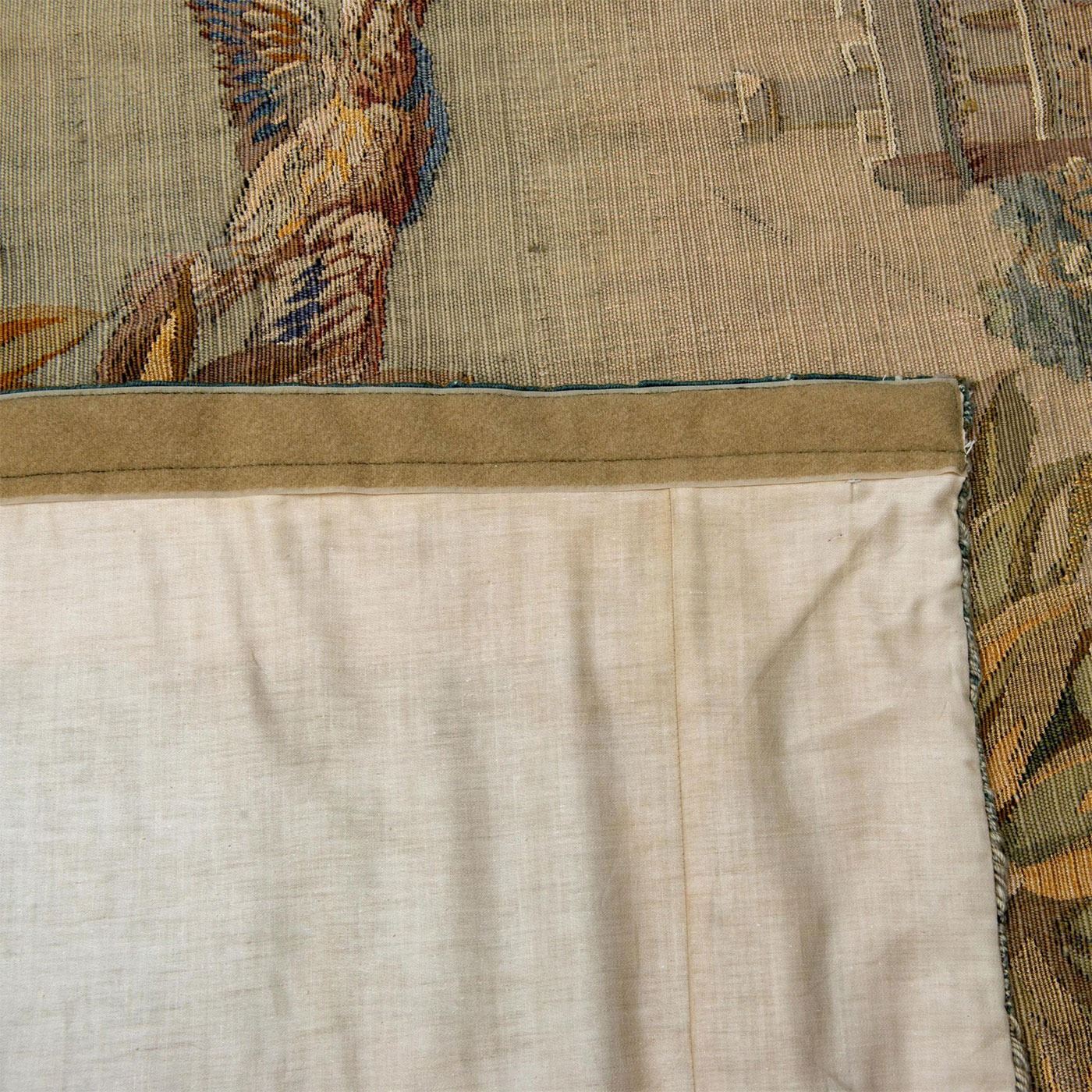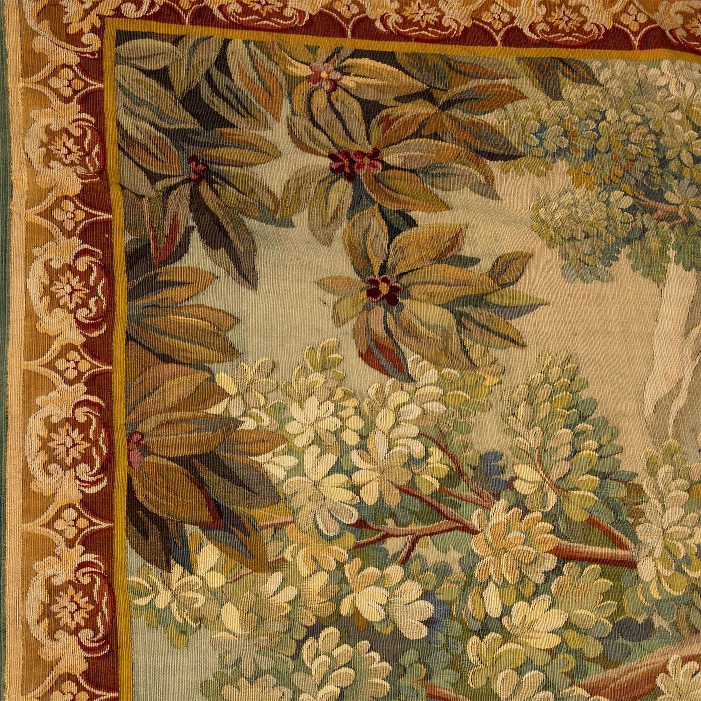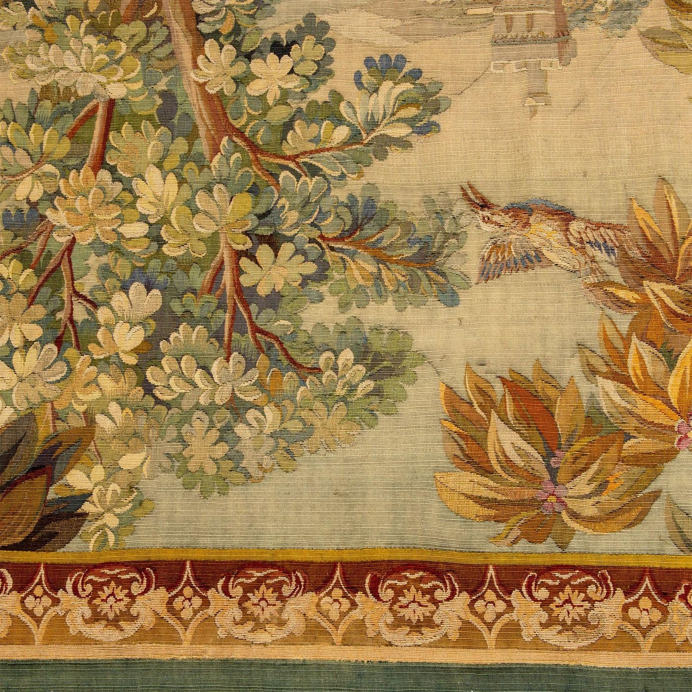 Impressive, handmade tapestry style woven piece with stunning scenes of lush forested area. The lush, green composition features a rooster and dog along a river stream in the foreground and a castle pictured in the background. Depicts a variety of trees and foliage. The scene is framed by a foliage patterned border. Age and use related wear; re-stitched border.