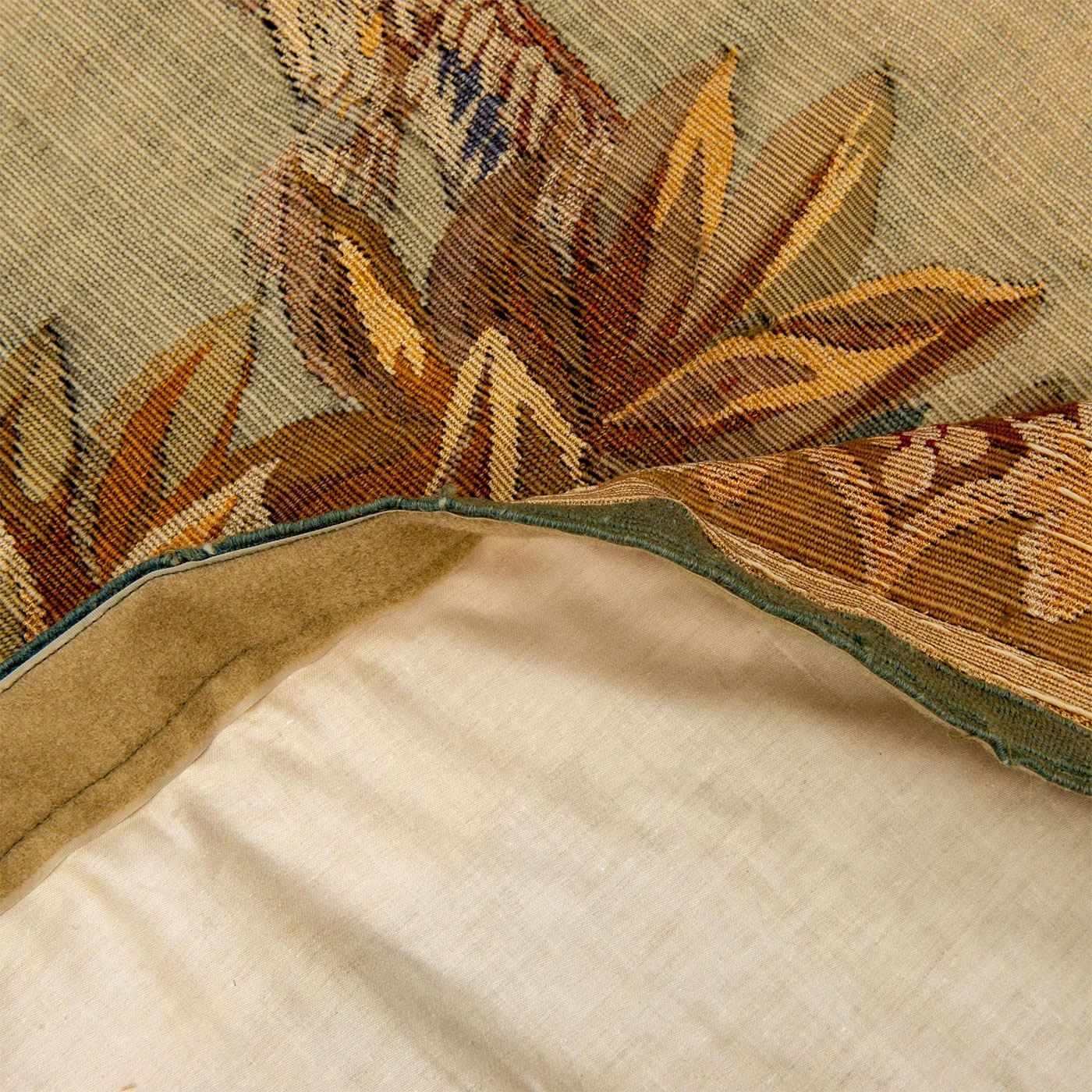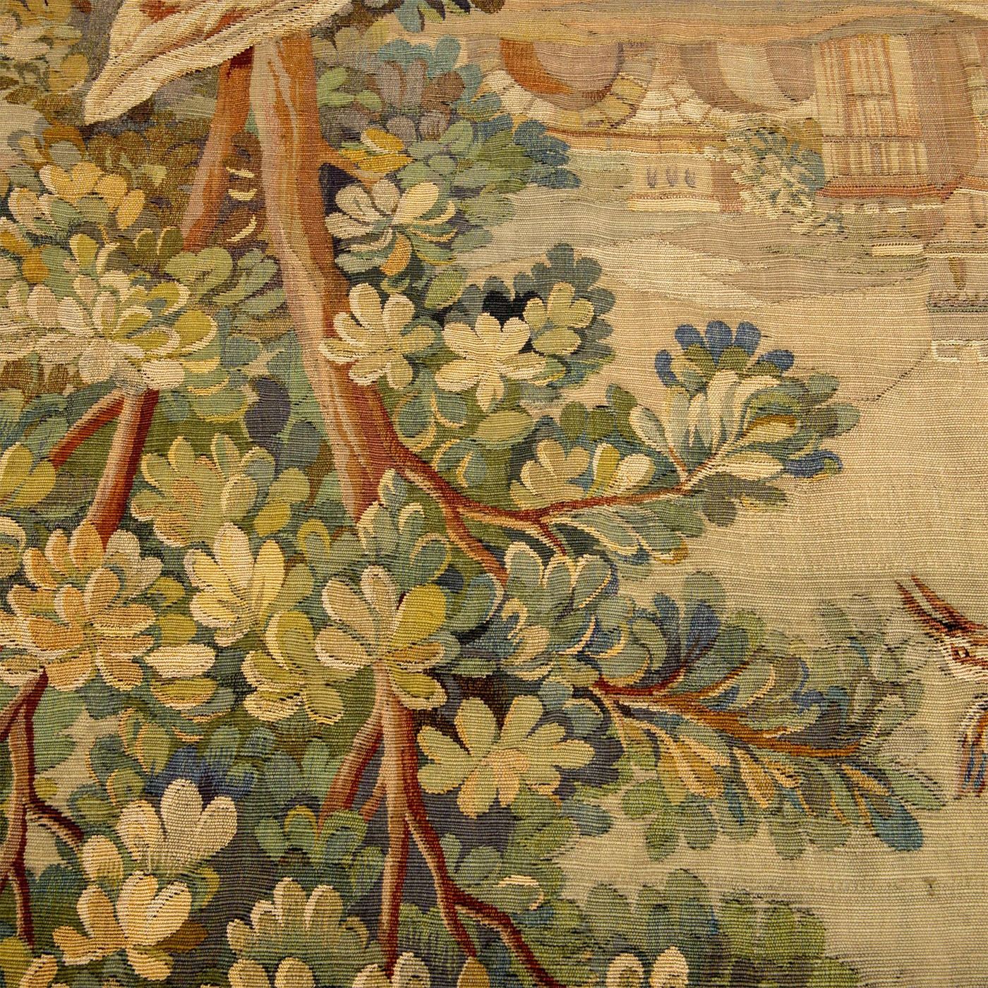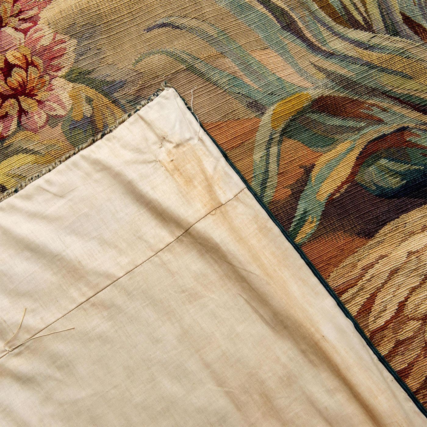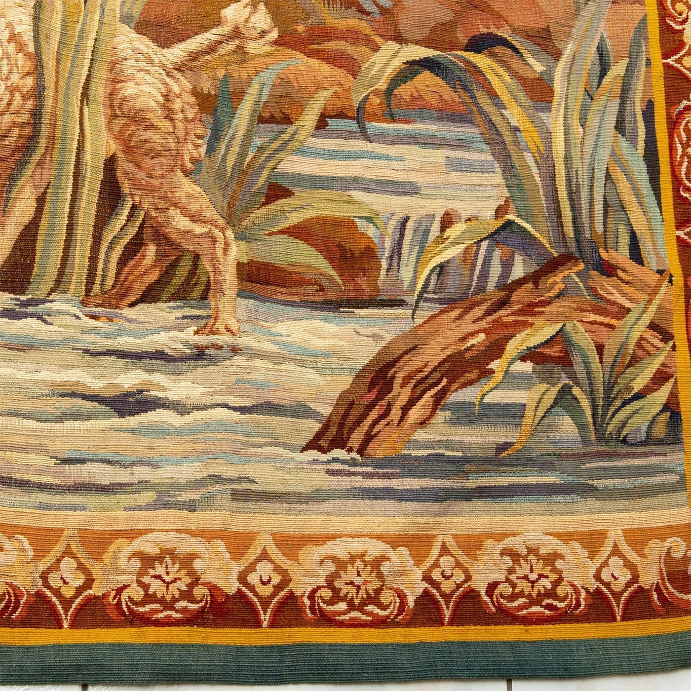 Impressive, handmade tapestry style woven piece with stunning scenes of lush forested area. The lush, green composition features a rooster and dog along a river stream in the foreground and a castle pictured in the background. Depicts a variety of trees and foliage. The scene is framed by a foliage patterned border. Age and use related wear; re-stitched border.