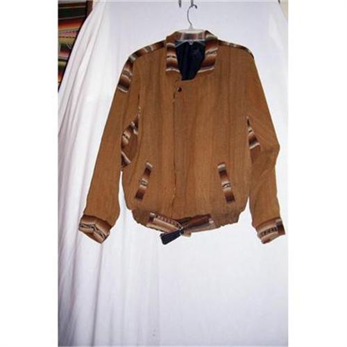 Very beautifull hand woven blanket jacket, in the bomber style. From the late 1950's, in unworn condition, doesn't look as if it had been worn. The jacket is 28 inches from neck to hem, 46 inches around the chest, 19 inch sleeve inseams. The jacket has ragland sleeves, popular in the late 1950's, this I think was an expensive jacket then, and was made for export, to look very American. Thankds for shopping in the land of Enchantment!