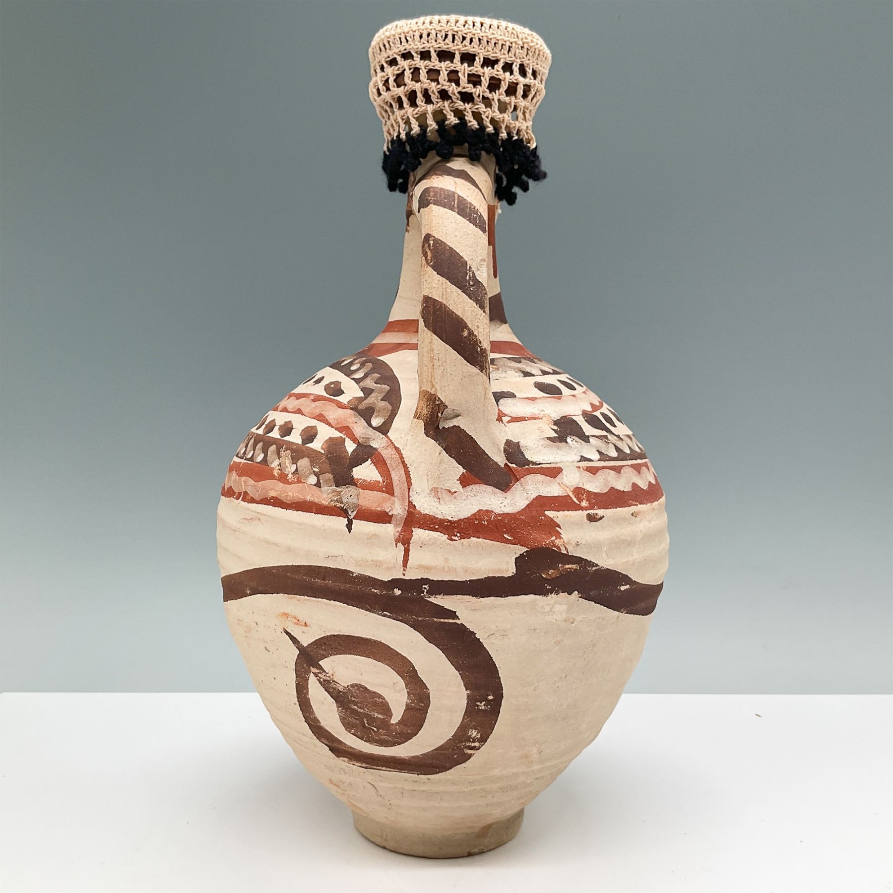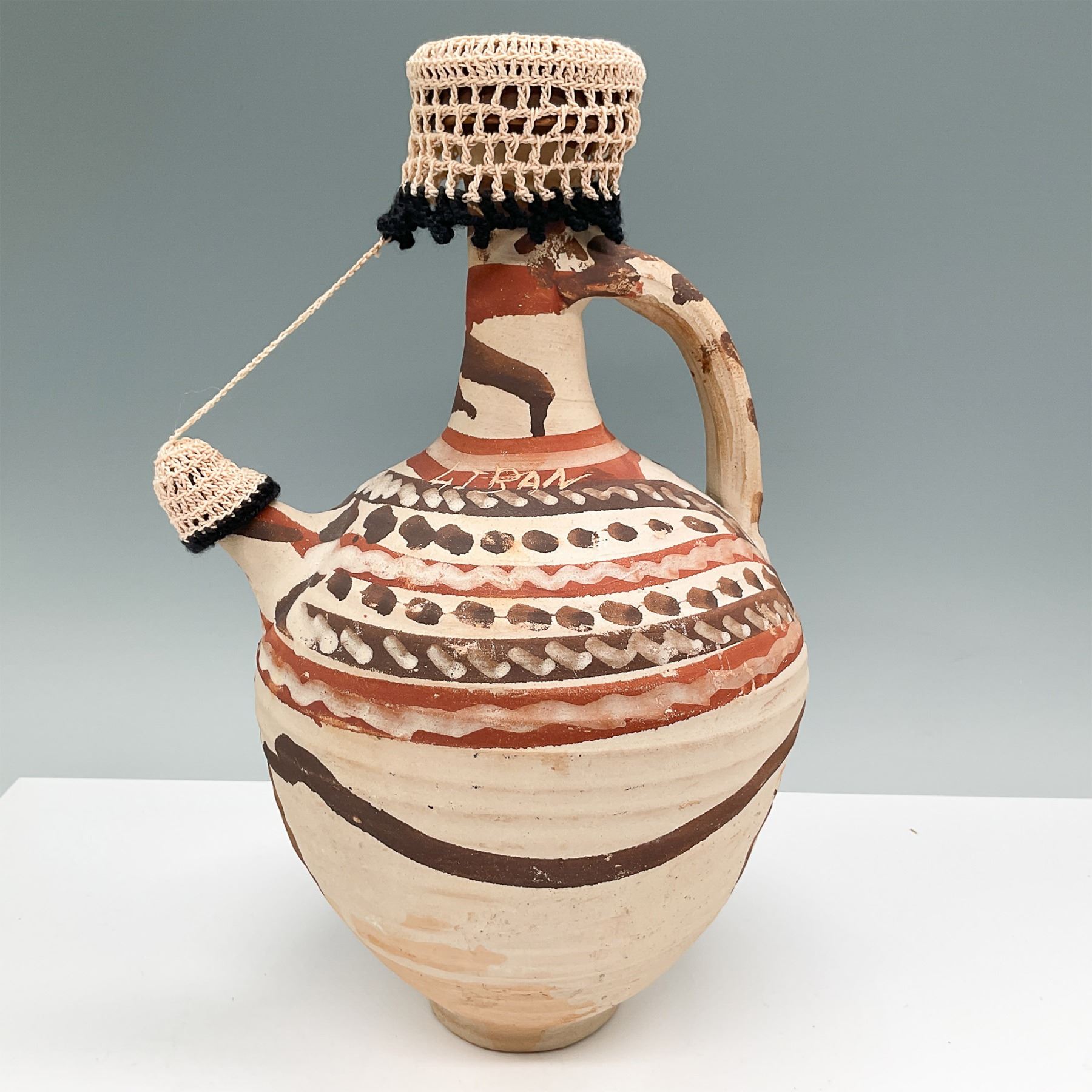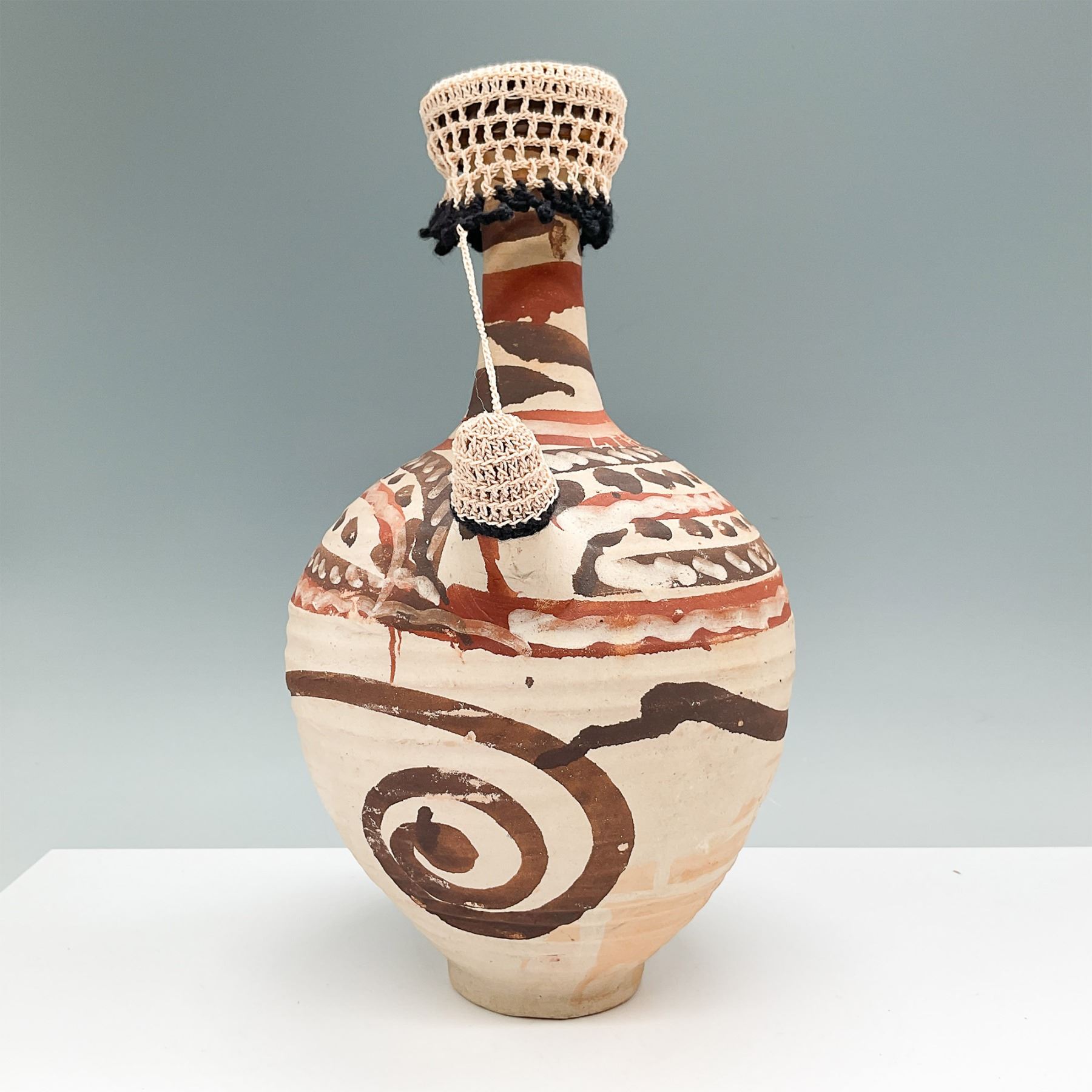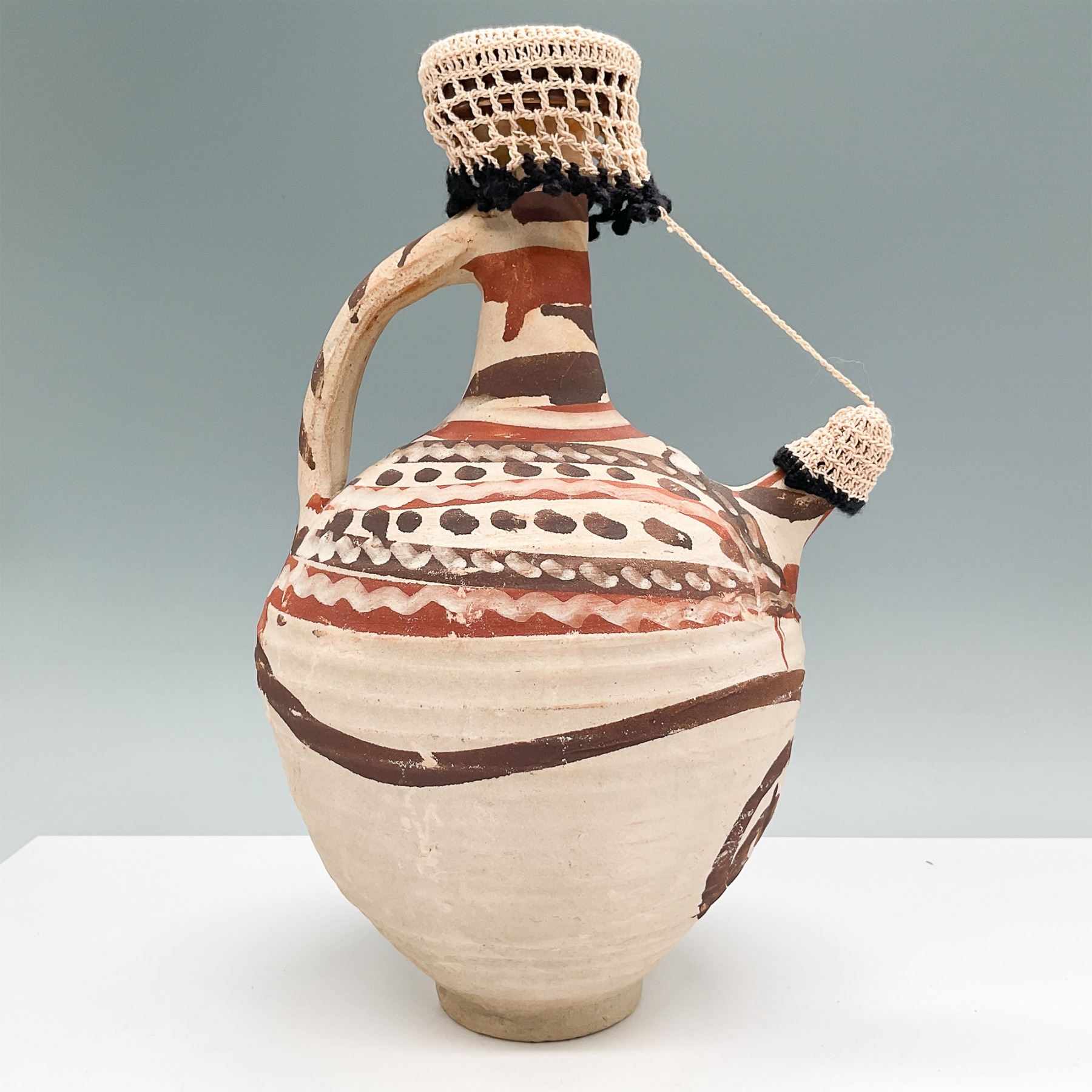 A vintage handcrafted ceramic pitcher signed "Liban," showcasing traditional tribal-style patterns in earthy red and brown tones. The pitcher features a rounded body, a single handle, and a spout, accented with crocheted covers on both the spout and handle for added charm. Standing 11"H, this unique piece reflects cultural artistry and craftsmanship. Perfect as a decorative item or collector's piece, with signs of wear consistent with its handmade nature and age.