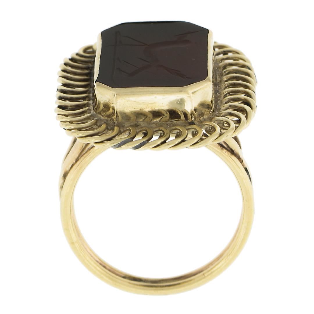 A vintage solid 14k yellow gold ring, with 1 rectangular carved cameo natural carnelian (16.2x1.9mm). The ring is size 7.0, weighs a total of 6.82 grams, and measures 24.9mm wide.