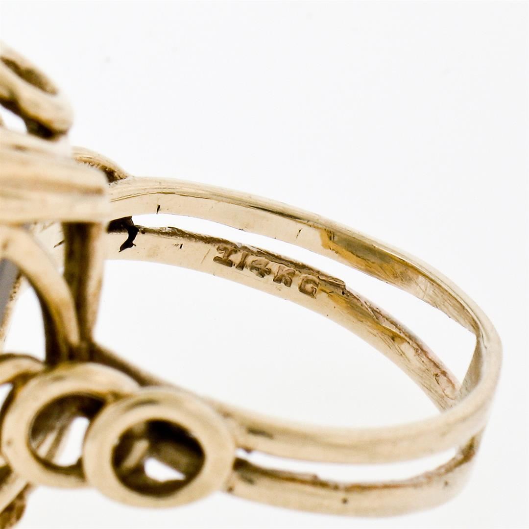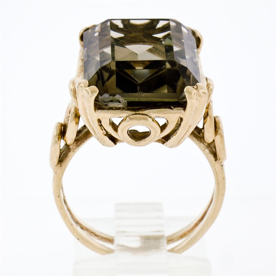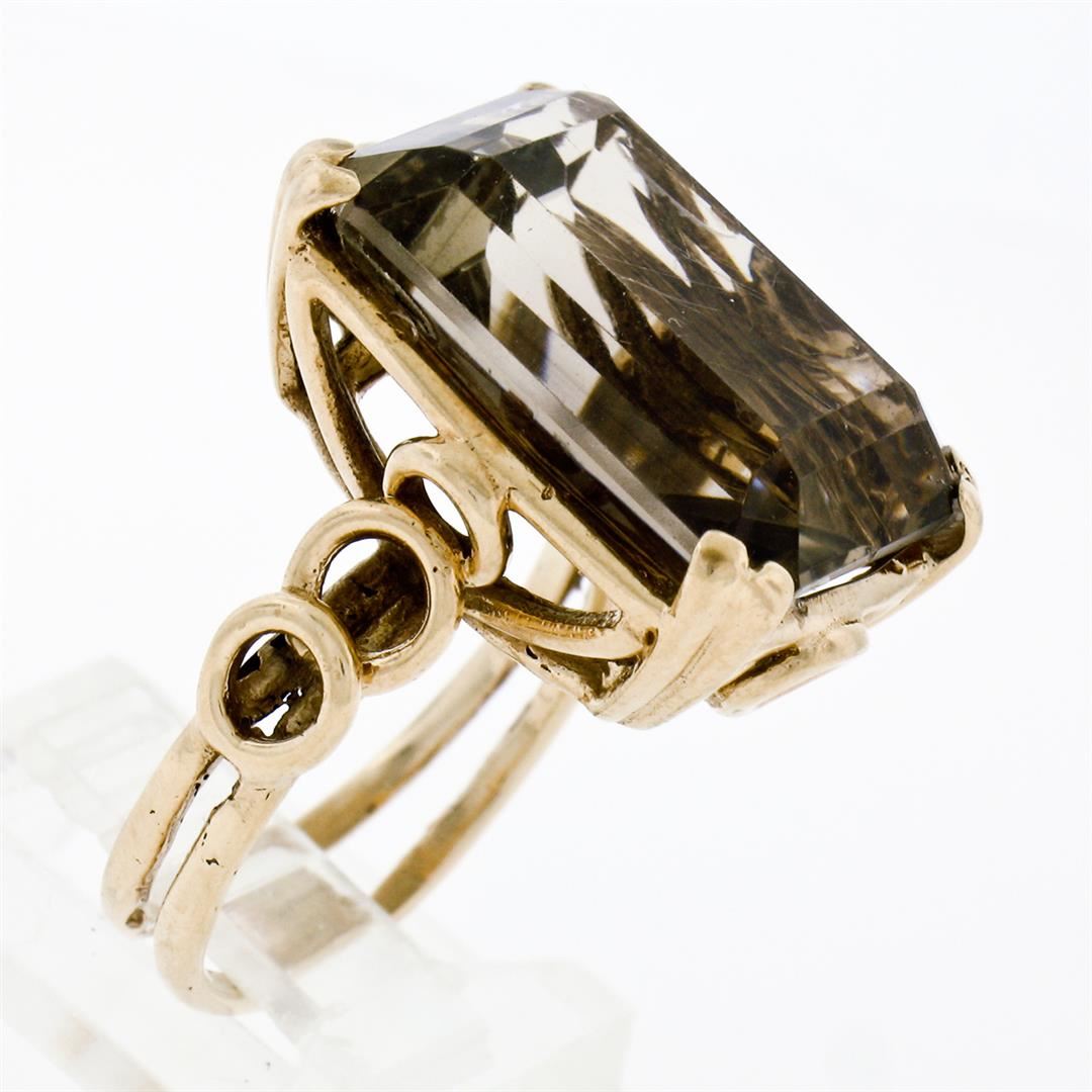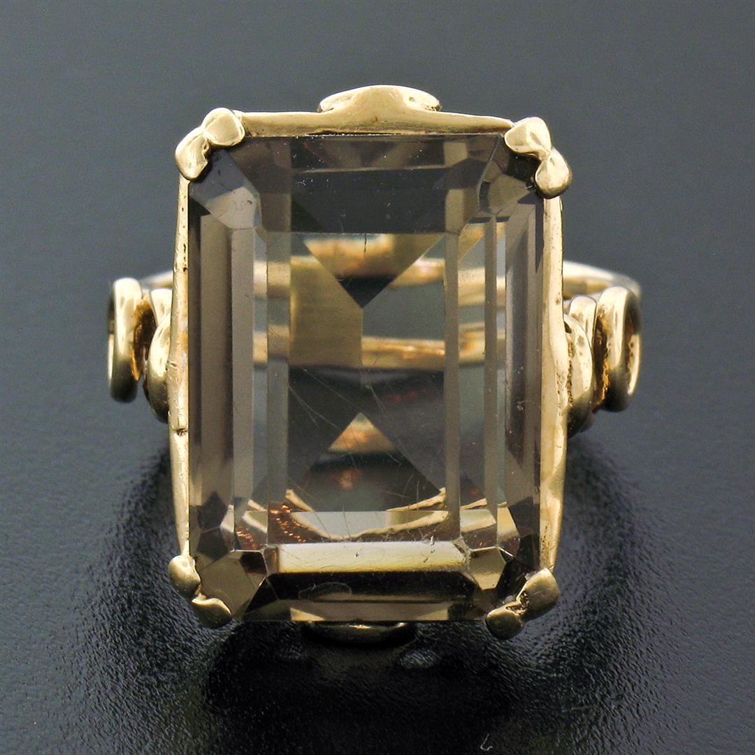 A vintage solid 14k yellow gold handmade solitaire ring, featuring 1 emerald step cut natural smoky quartz (18.10x13.15mm). The ring is size 7.0, weighs a total of 9.67 grams, and measures 21.0mm wide.