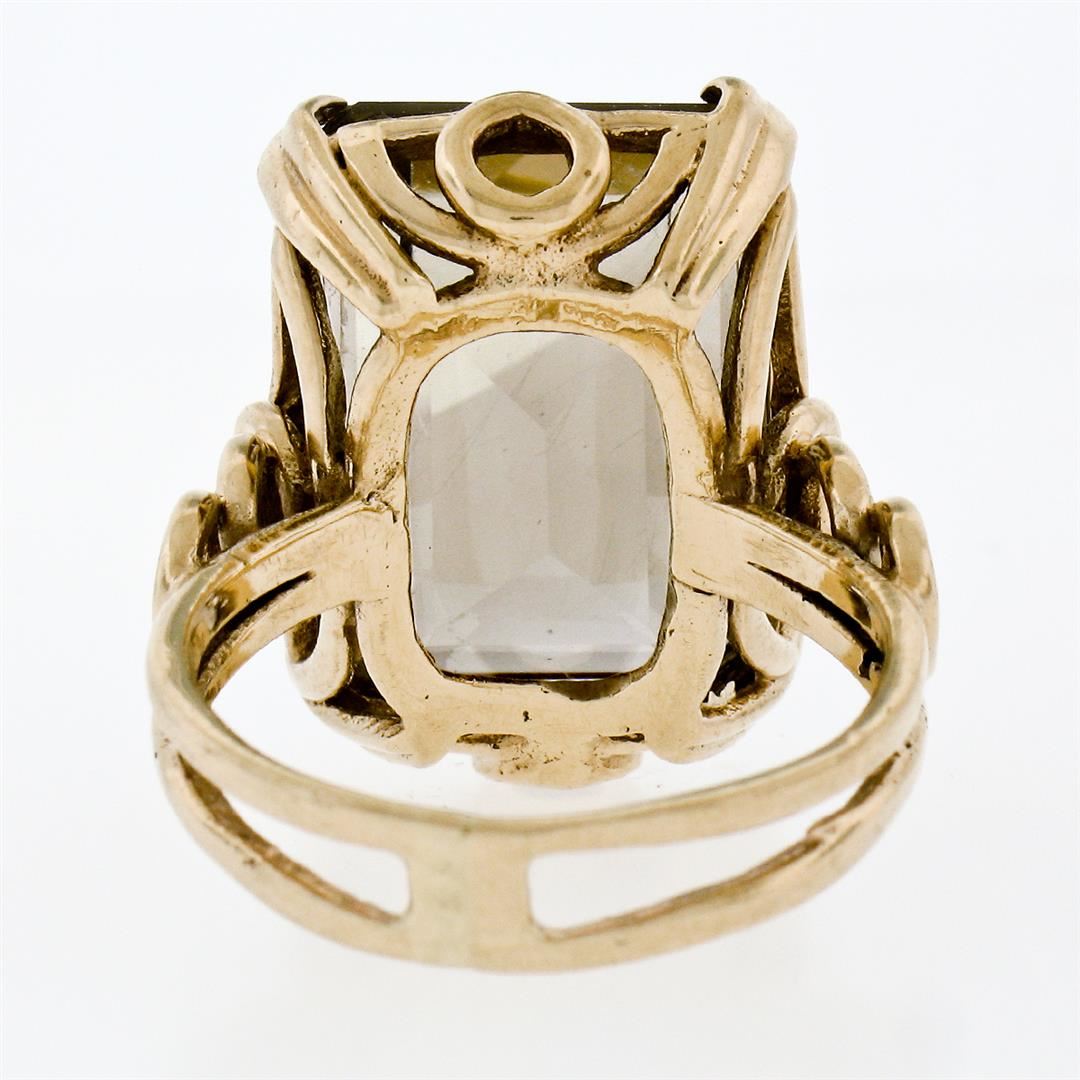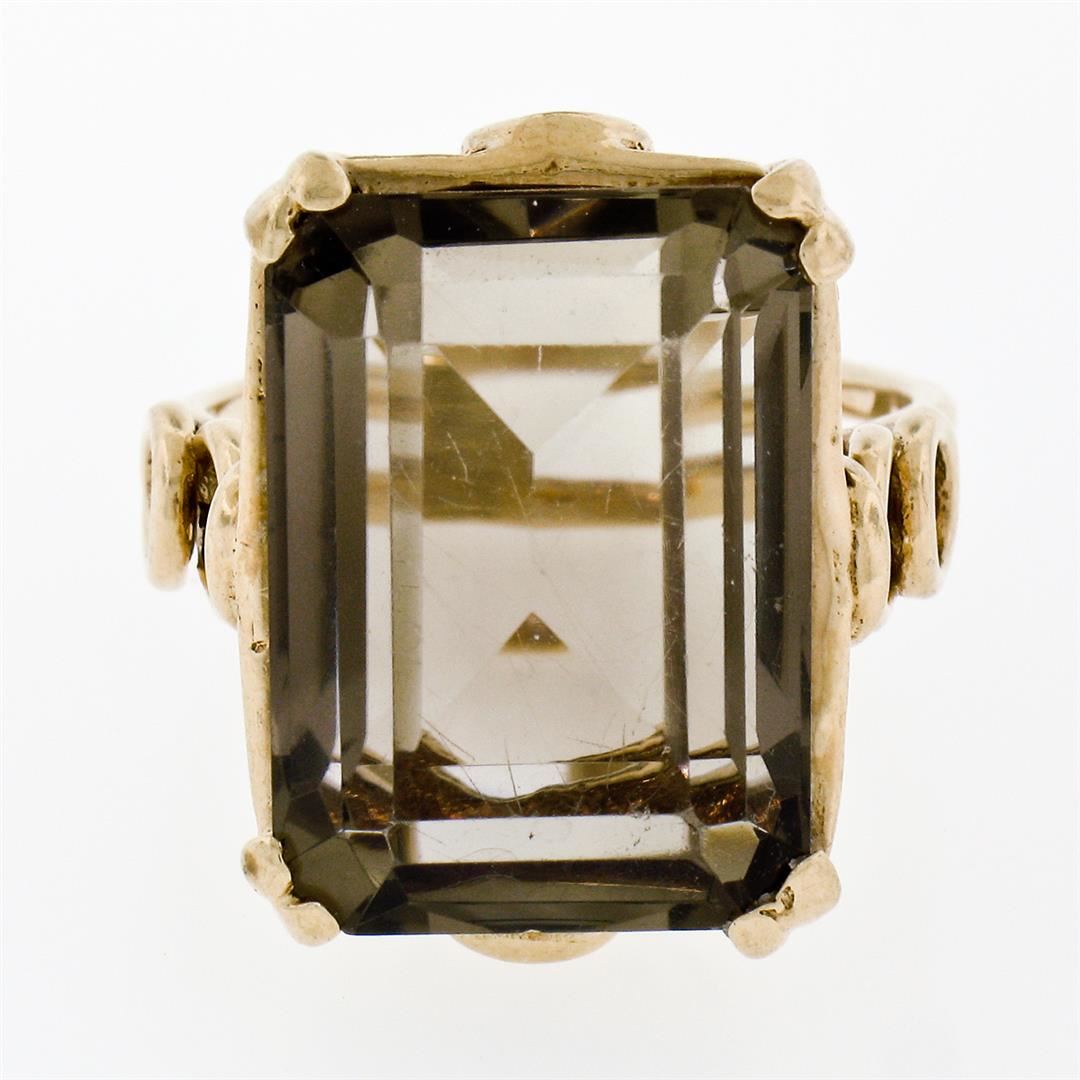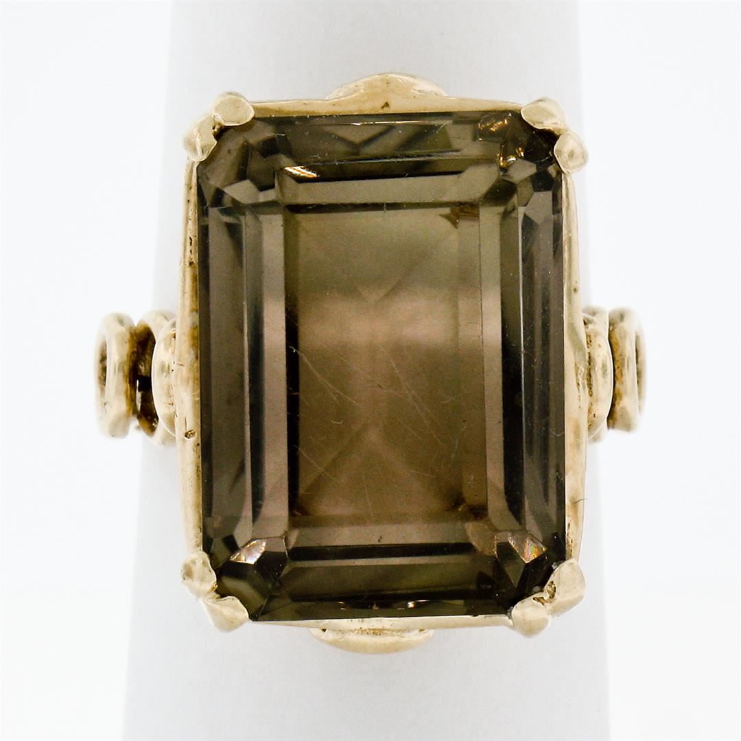 A vintage solid 14k yellow gold handmade solitaire ring, featuring 1 emerald step cut natural smoky quartz (18.10x13.15mm). The ring is size 7.0, weighs a total of 9.67 grams, and measures 21.0mm wide.