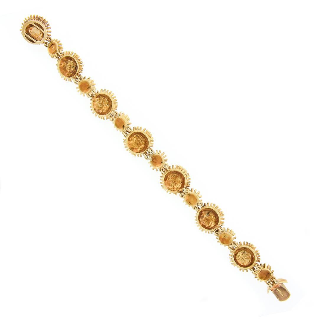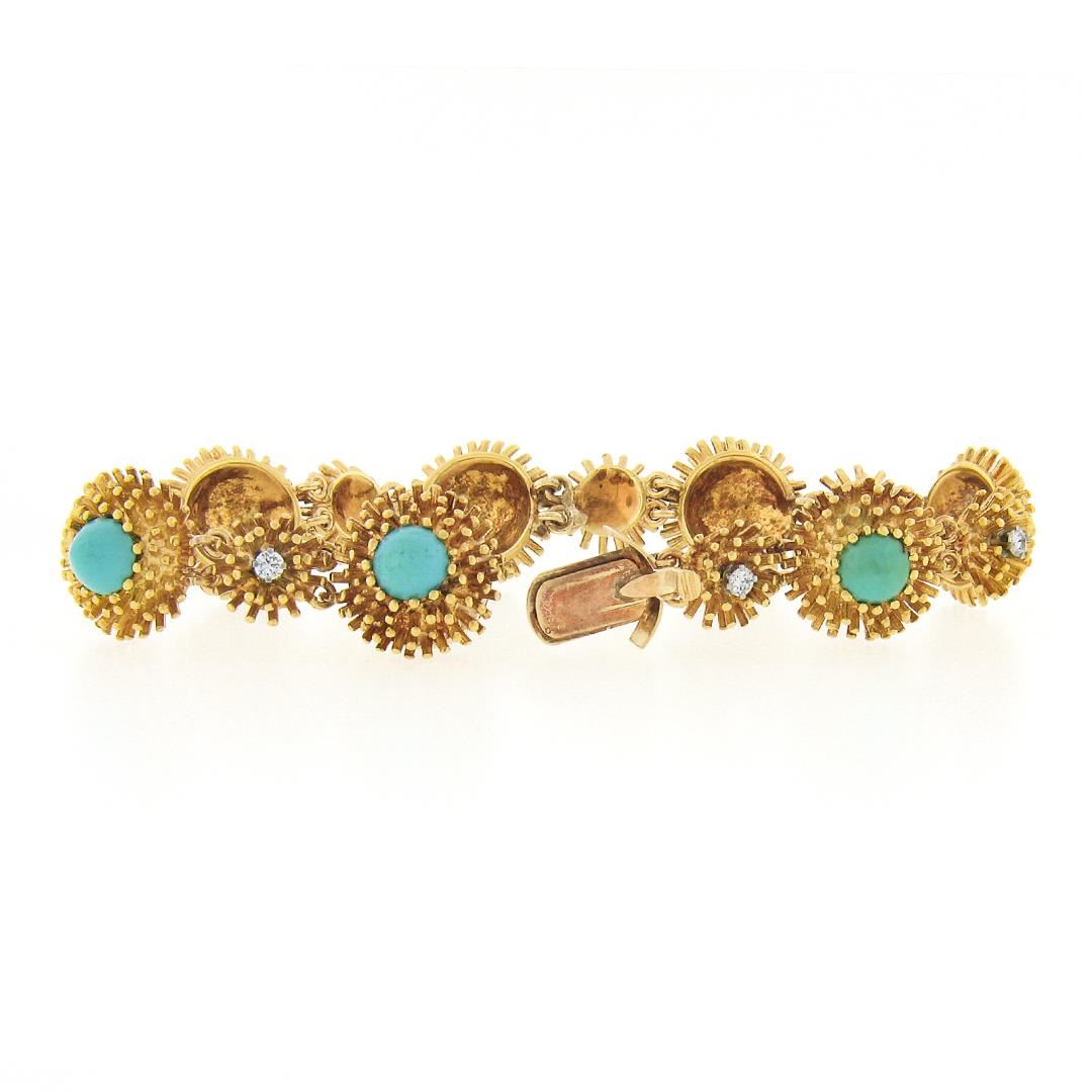 A vintage solid 18k yellow gold handmade link bracelet, with 7 round brilliant cut natural diamonds (F/G- VS1/VS2 ; 0.45ctw), alternated with 7 round cabochon cut natural turquoises (6.9mm each). It weighs a total of 44.71 grams, measures 16mm wide, and measures 7 inches in length.