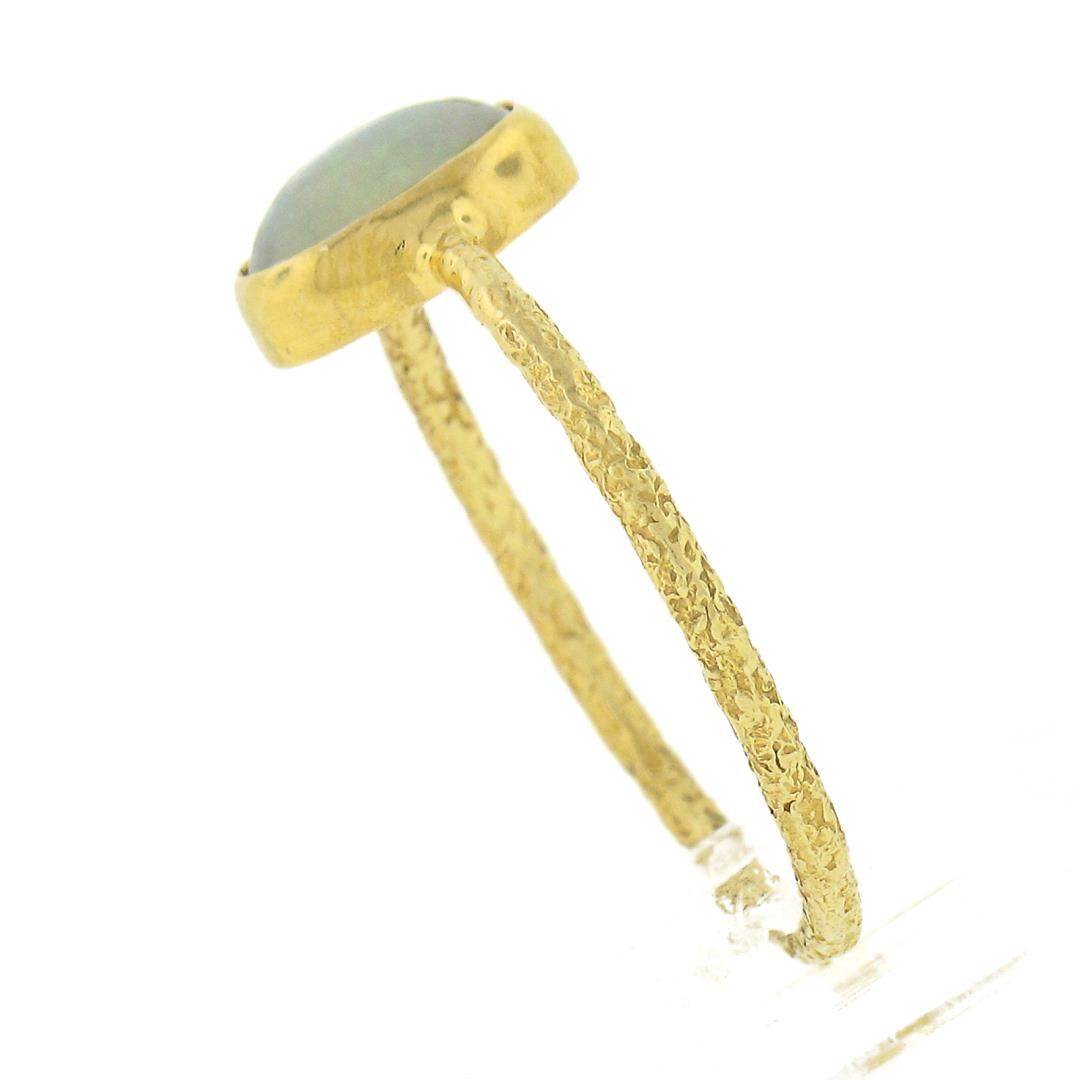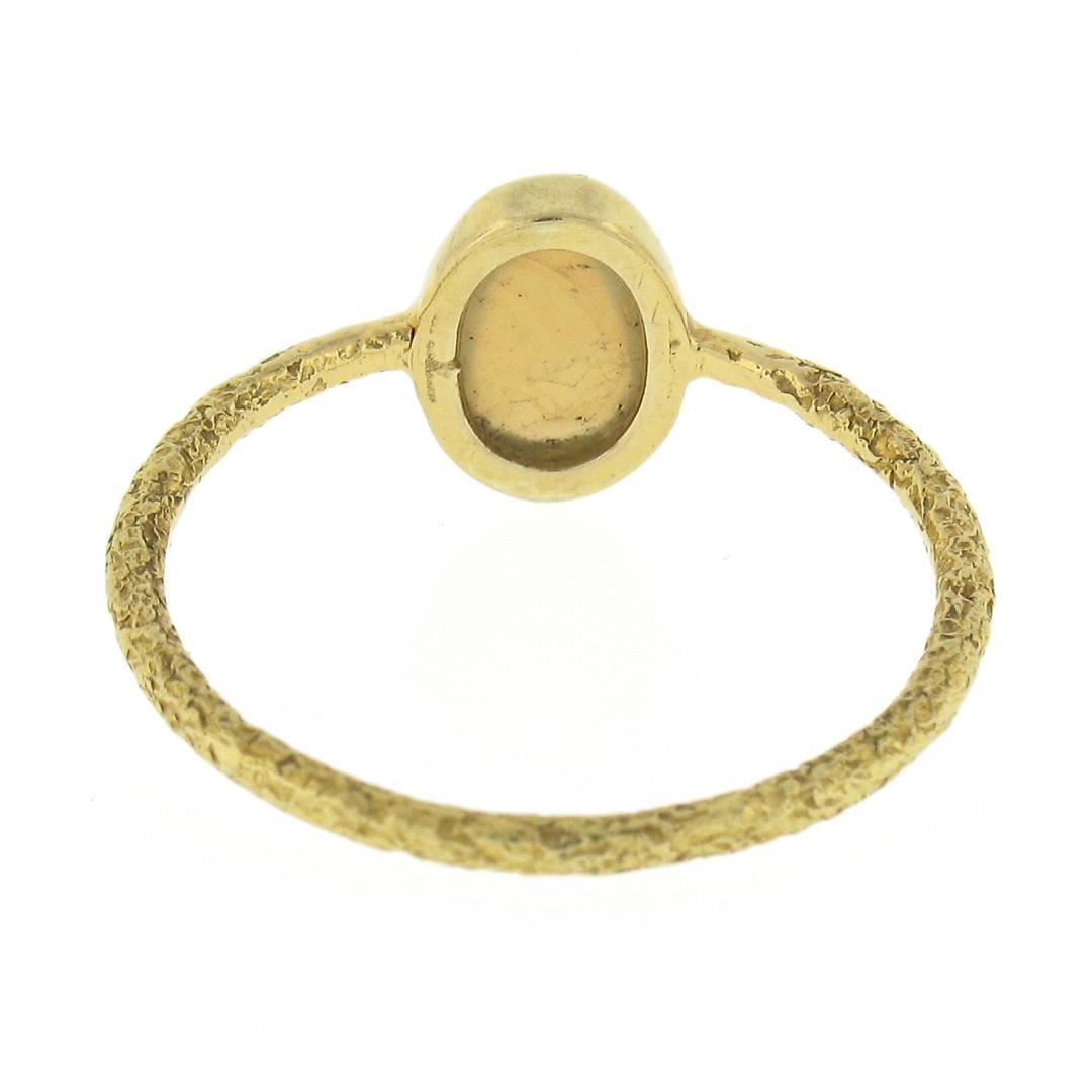 A vintage handmade solid 18k yellow gold solitaire ring, with 1 oval cabochon cut natural opal (6.5x4.5mm). The ring is size 6.5, weighs a total of 1.45 grams, and measures 8.2mm wide.