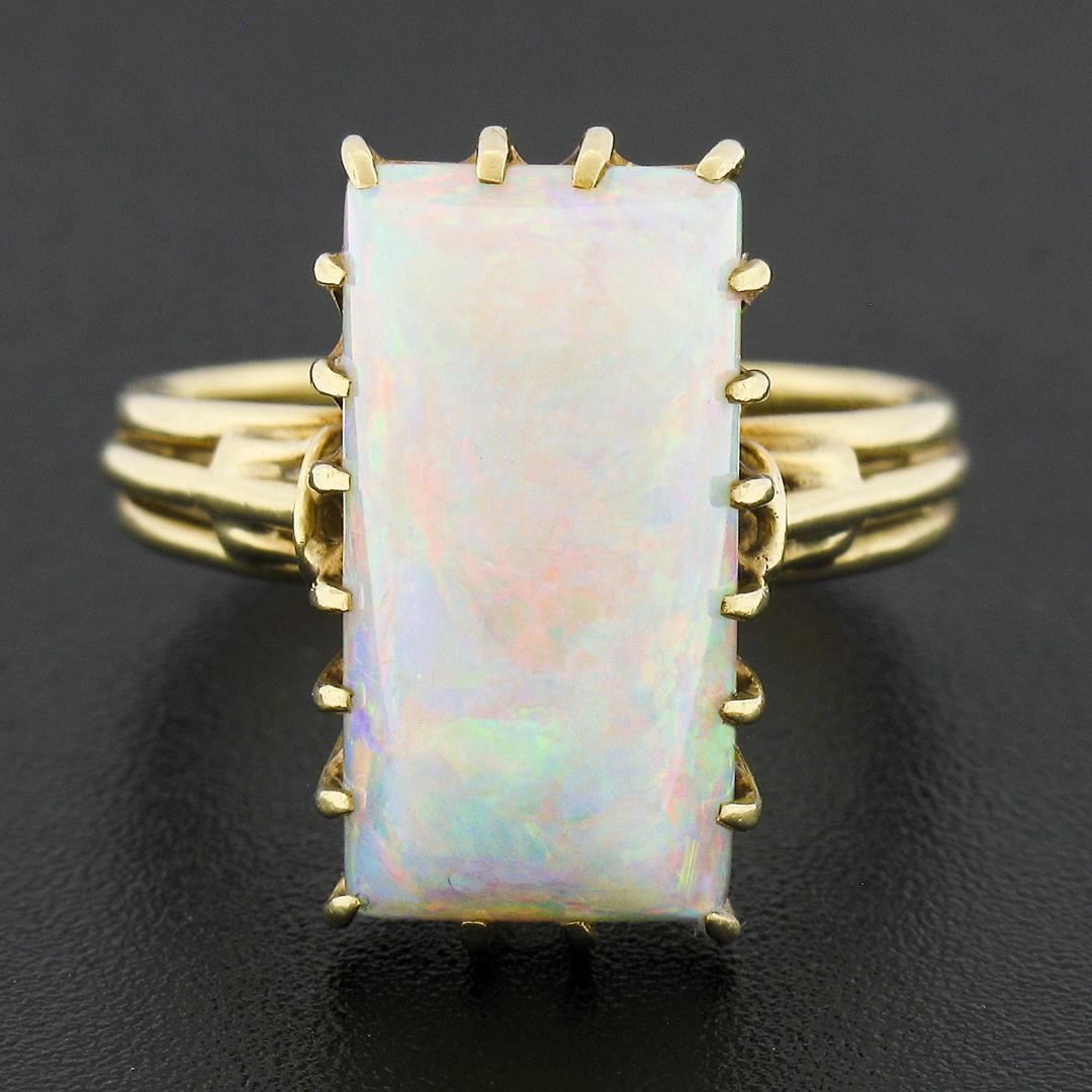 A vintage handmade solid 18k yellow gold solitaire ring, with 1 rectangular cut natural opal (17.1x8.9mm). The ring is size 8.0, weighs a total of 6.43 grams, and measures 18.70mm wide.
