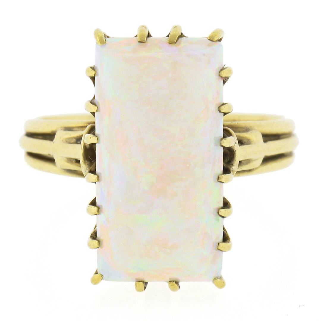 A vintage handmade solid 18k yellow gold solitaire ring, with 1 rectangular cut natural opal (17.1x8.9mm). The ring is size 8.0, weighs a total of 6.43 grams, and measures 18.70mm wide.