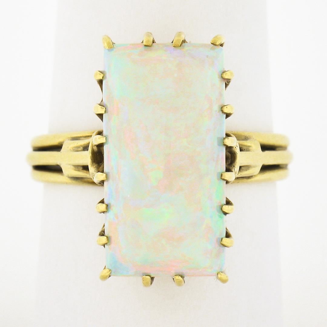 A vintage handmade solid 18k yellow gold solitaire ring, with 1 rectangular cut natural opal (17.1x8.9mm). The ring is size 8.0, weighs a total of 6.43 grams, and measures 18.70mm wide.