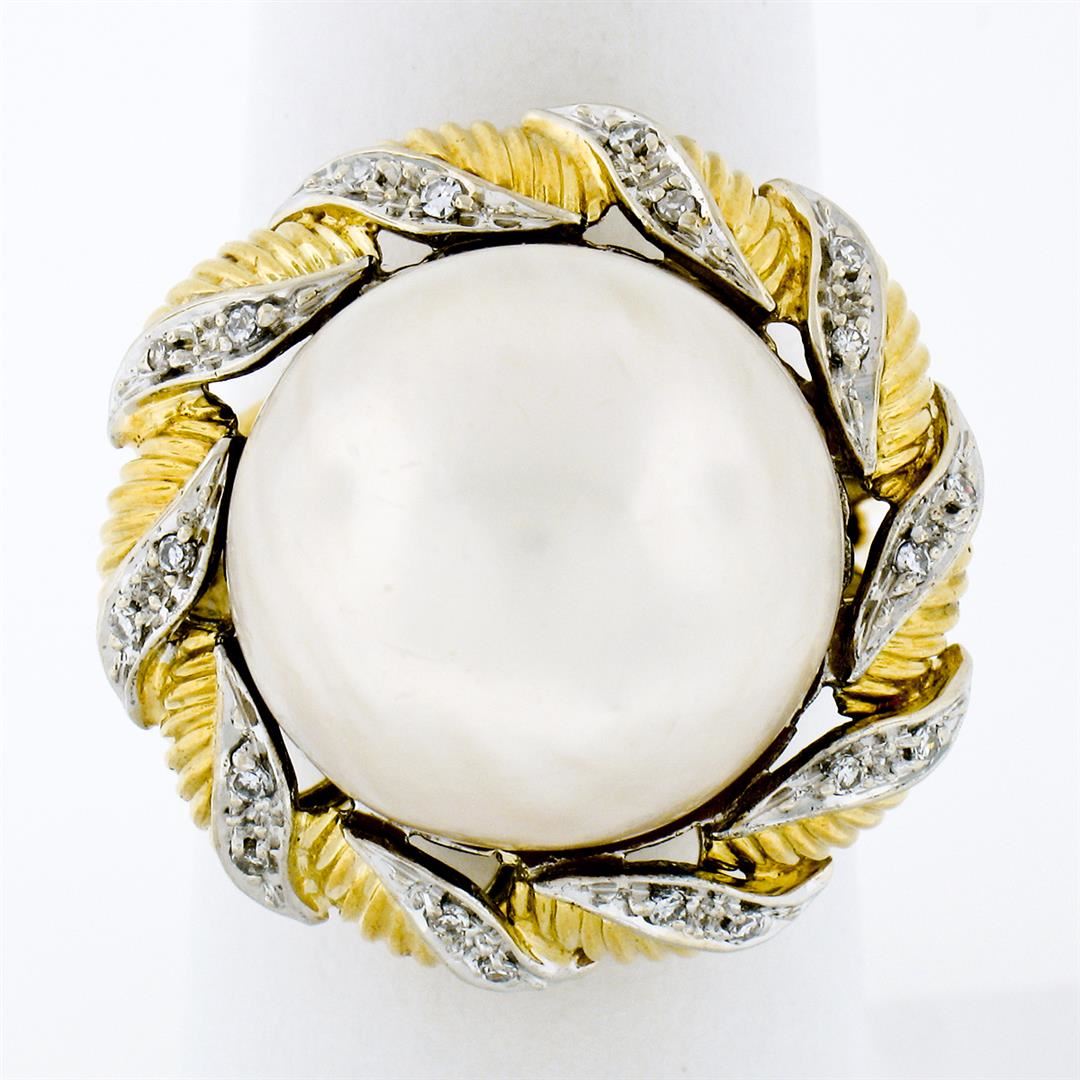 A vintage handmade 18k yellow and white gold swirl ring featuring a round white cultured mabe pearl (16.0mm) and 20 round single cut diamonds (G/H - VS2; 0.25ctw). The ring is size 7.5, weighs a total of 15.13 grams, and measures 23.7mm wide.