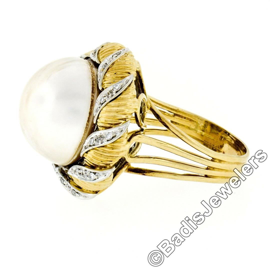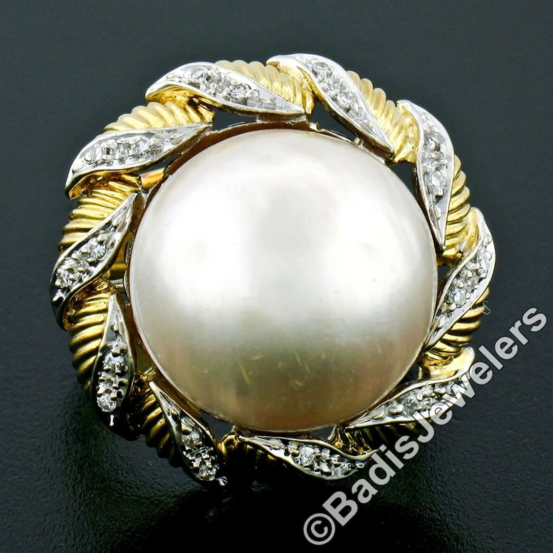 A vintage handmade 18kt yellow and white gold swirl ring featuring a round white cultured mabe pearl (16.0mm) and 20 round single cut diamonds (G/H - VS2; 0.25ctw). The ring is size 7.5, weighs a total of 15.13 grams, and measures 23.7mm wide.
