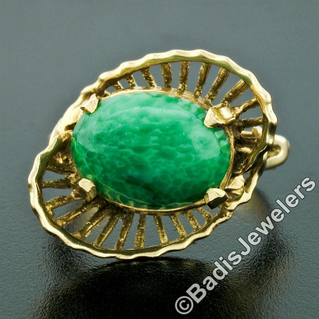 A vintage handmade 18kt yellow gold ring featuring an oval cabochon cut natural green jade (13.9x10.0mm). The ring is size 8, weighs a total of 7.59 grams, and measures 18.5mm wide.