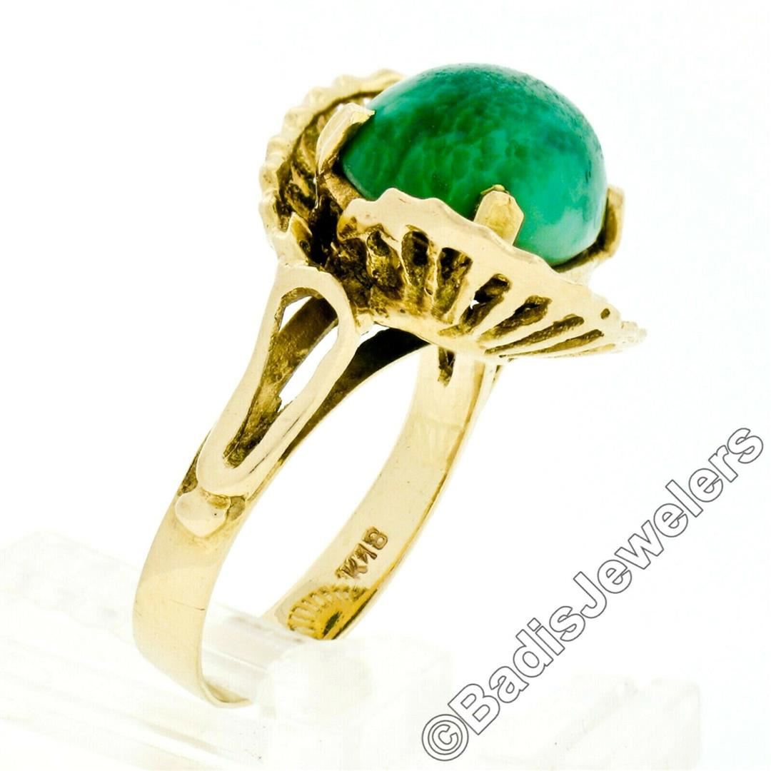A vintage handmade 18kt yellow gold ring featuring an oval cabochon cut natural green jade (13.9x10.0mm). The ring is size 8, weighs a total of 7.59 grams, and measures 18.5mm wide.