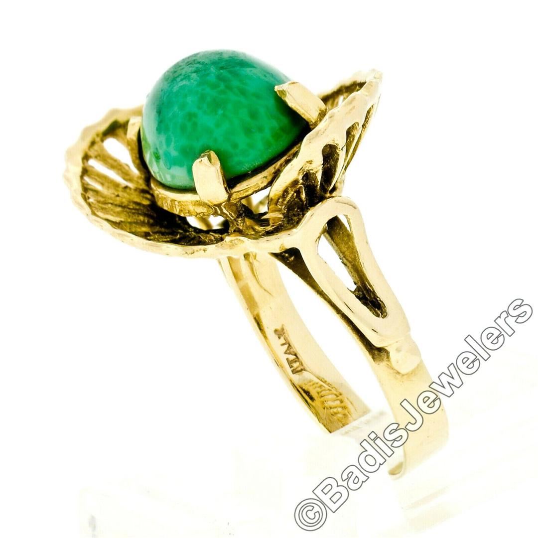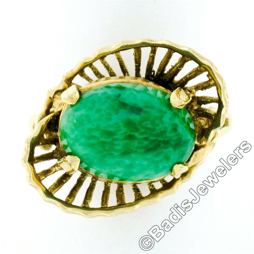 A vintage handmade 18kt yellow gold ring featuring an oval cabochon cut natural green jade (13.9x10.0mm). The ring is size 8, weighs a total of 7.59 grams, and measures 18.5mm wide.