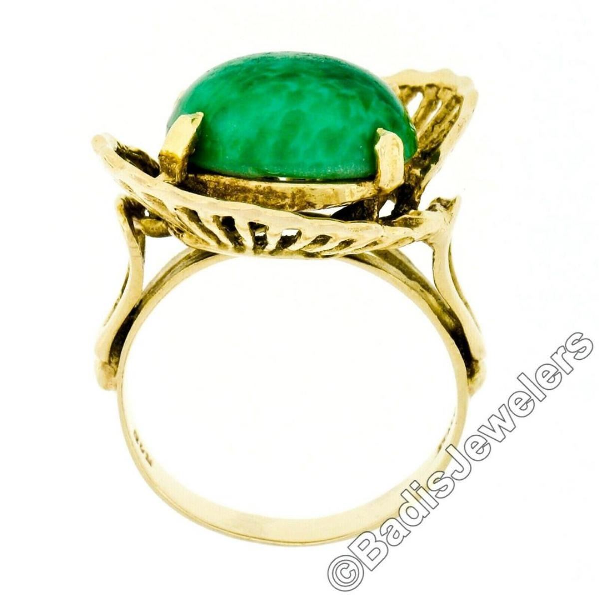 A vintage handmade 18kt yellow gold ring featuring an oval cabochon cut natural green jade (13.9x10.0mm). The ring is size 8, weighs a total of 7.59 grams, and measures 18.5mm wide.
