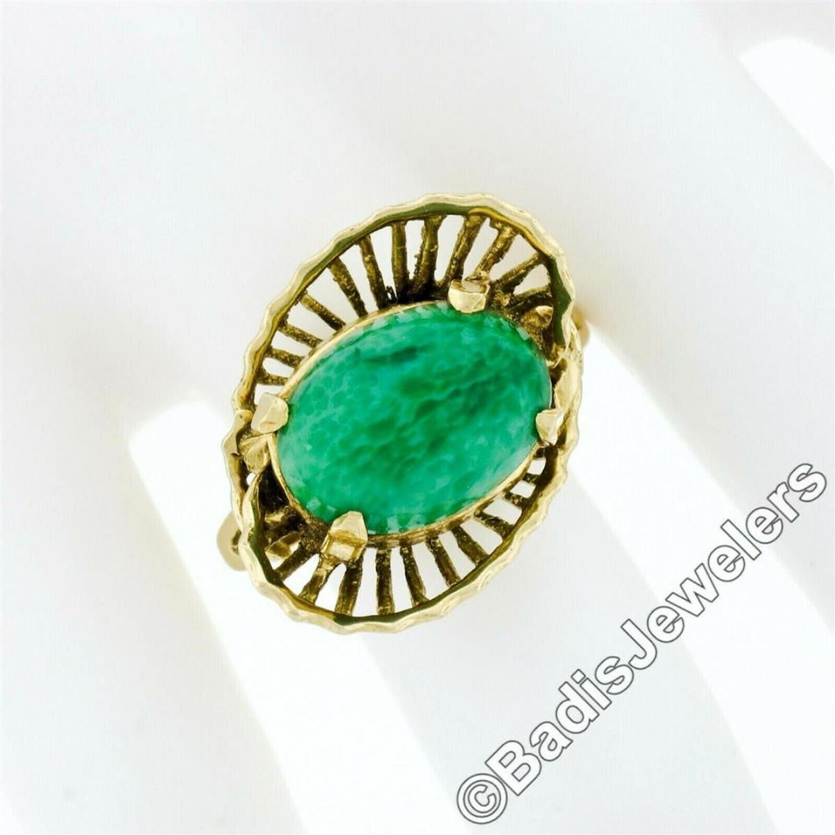 A vintage handmade 18kt yellow gold ring featuring an oval cabochon cut natural green jade (13.9x10.0mm). The ring is size 8, weighs a total of 7.59 grams, and measures 18.5mm wide.