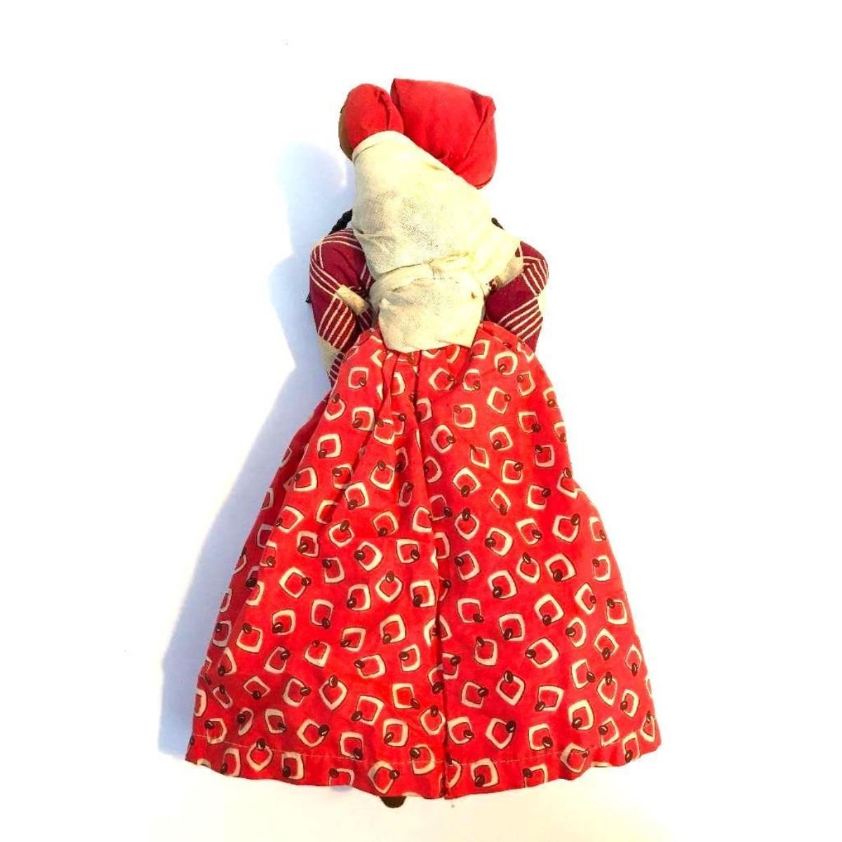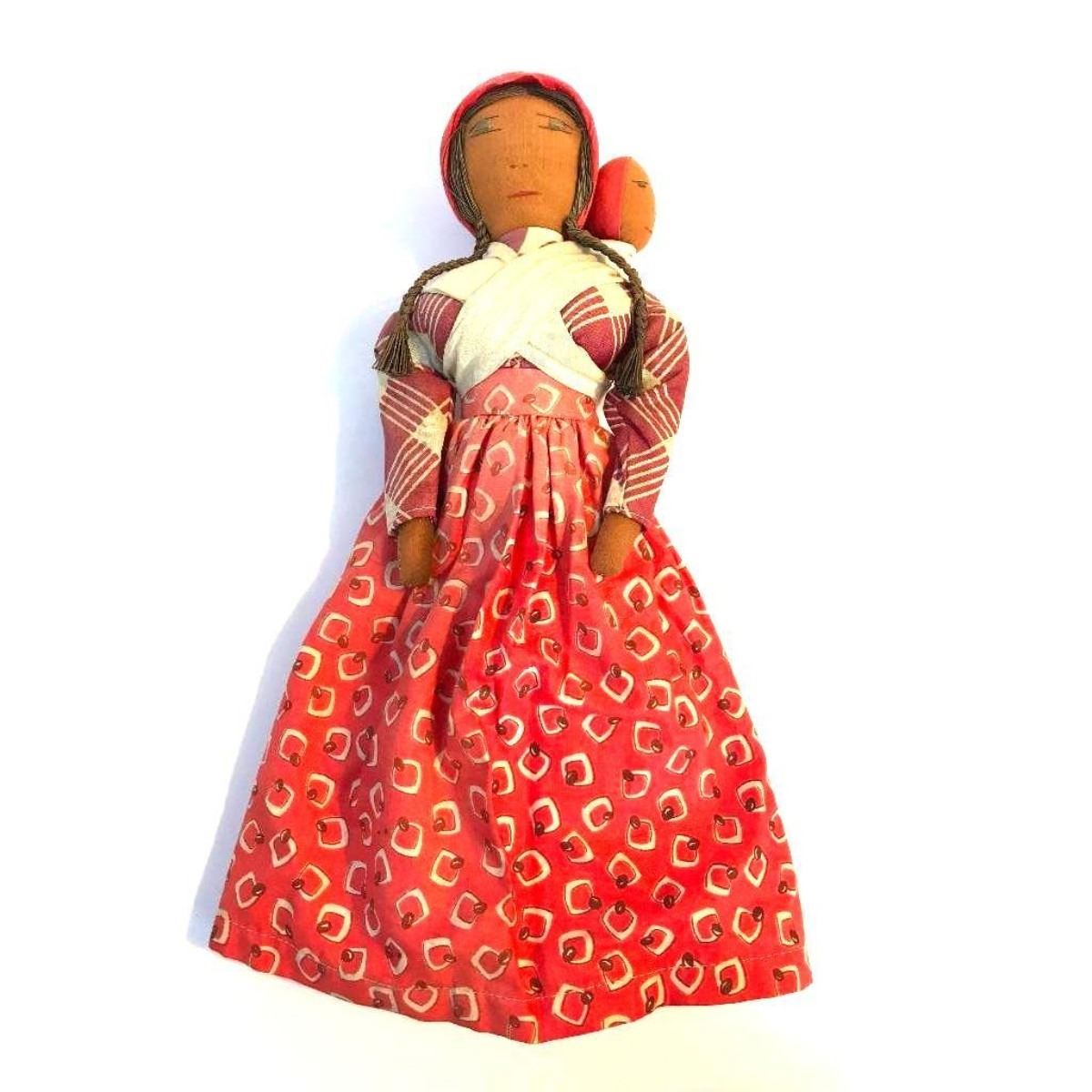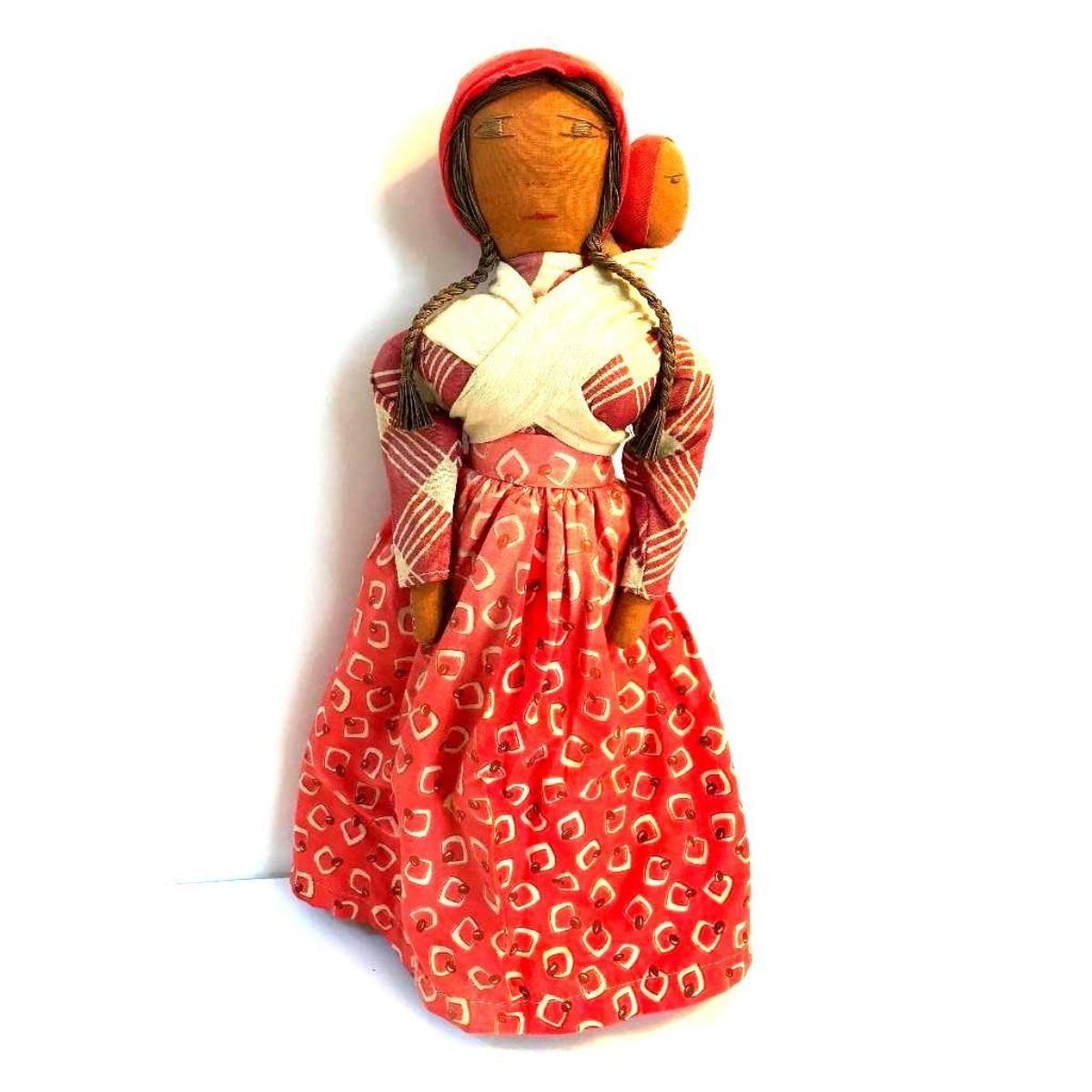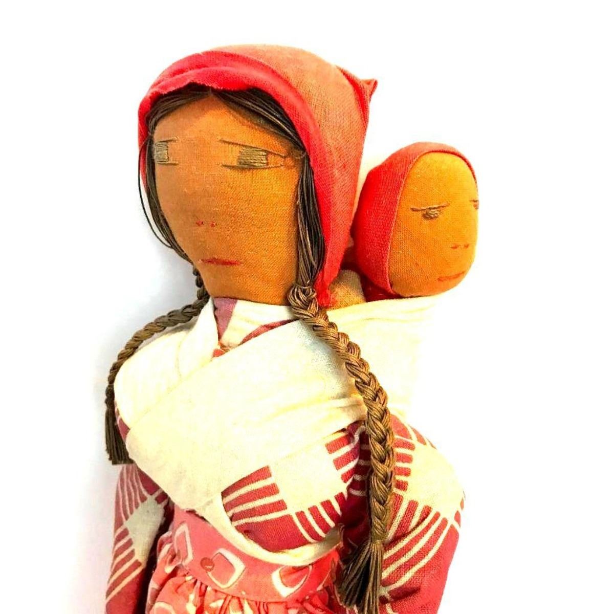 Vintage 1970's handmade cloth doll, Native American, Cherokee Indian Squaw & Papoose, made by members of the Cherokee tribe, Qualla Reservation, Cherokee, NC. Original label pinned inside dress. 13" H.Â