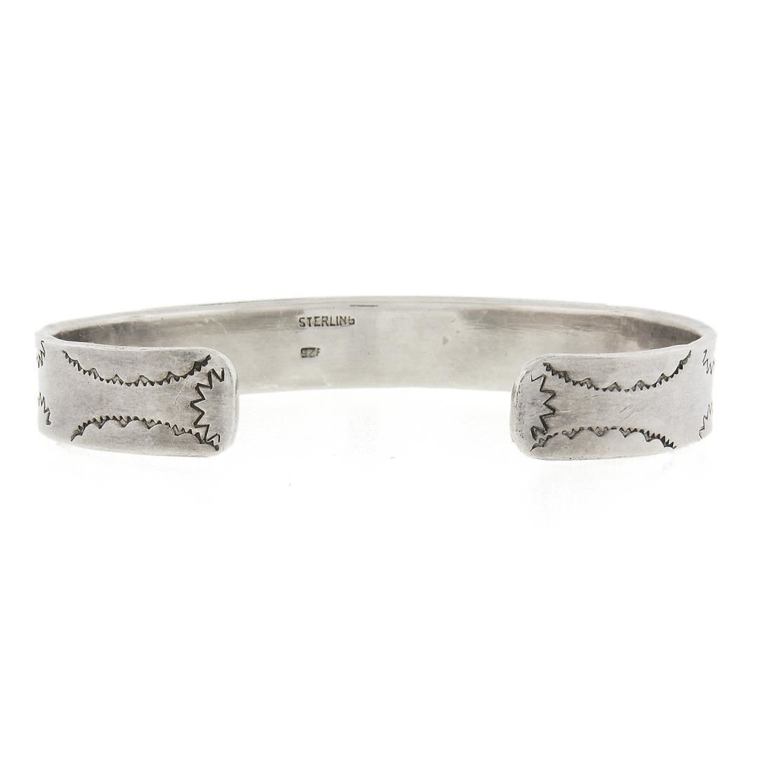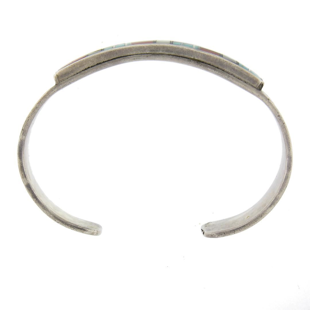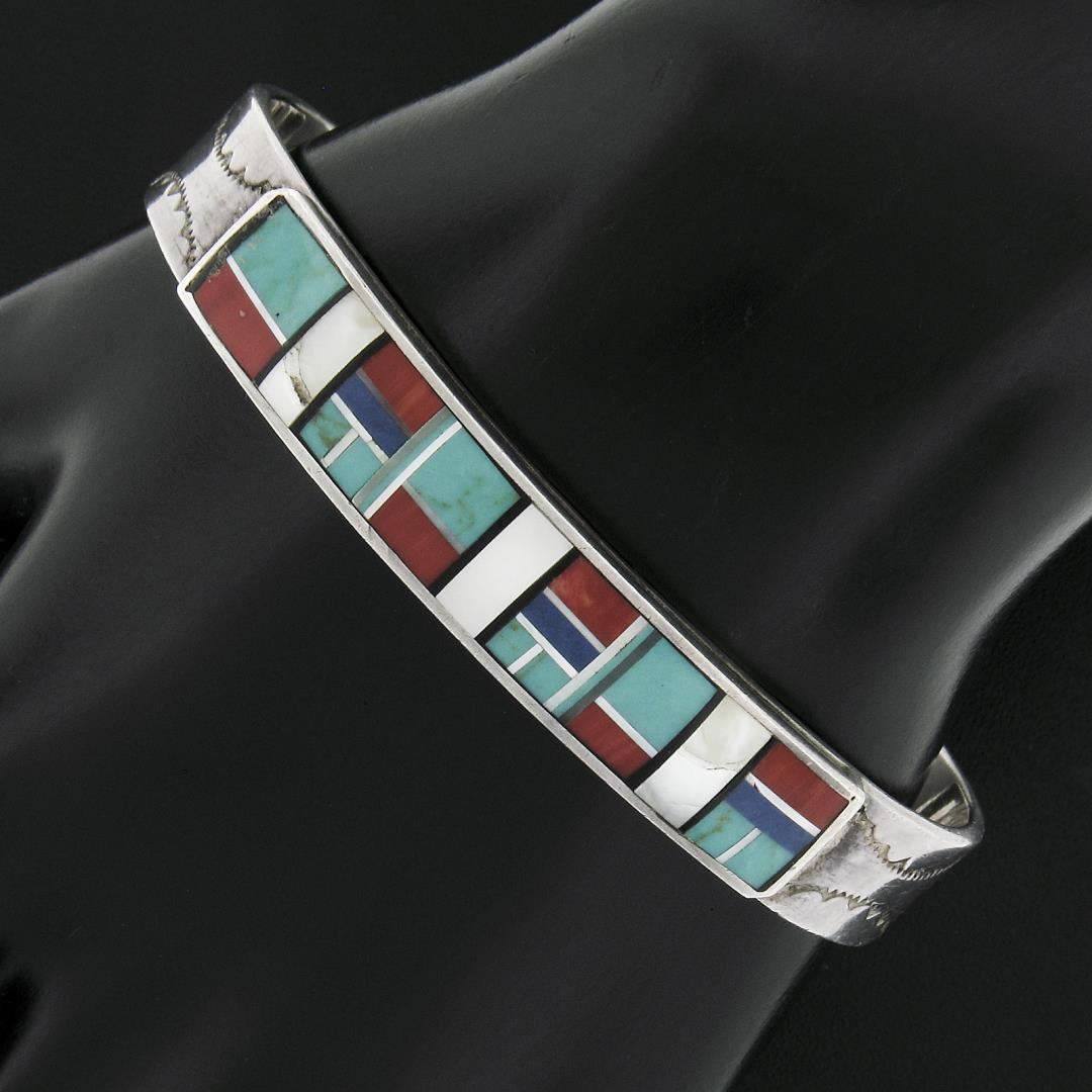 A vintage najavo silver open cuff bangle bracelet, with inlaid turquoise, coral, lapis, black onyx & mother of pearl. It weighs a total of 31.94 grams, measures 10mm wide, and measures 6.5 inches in length.