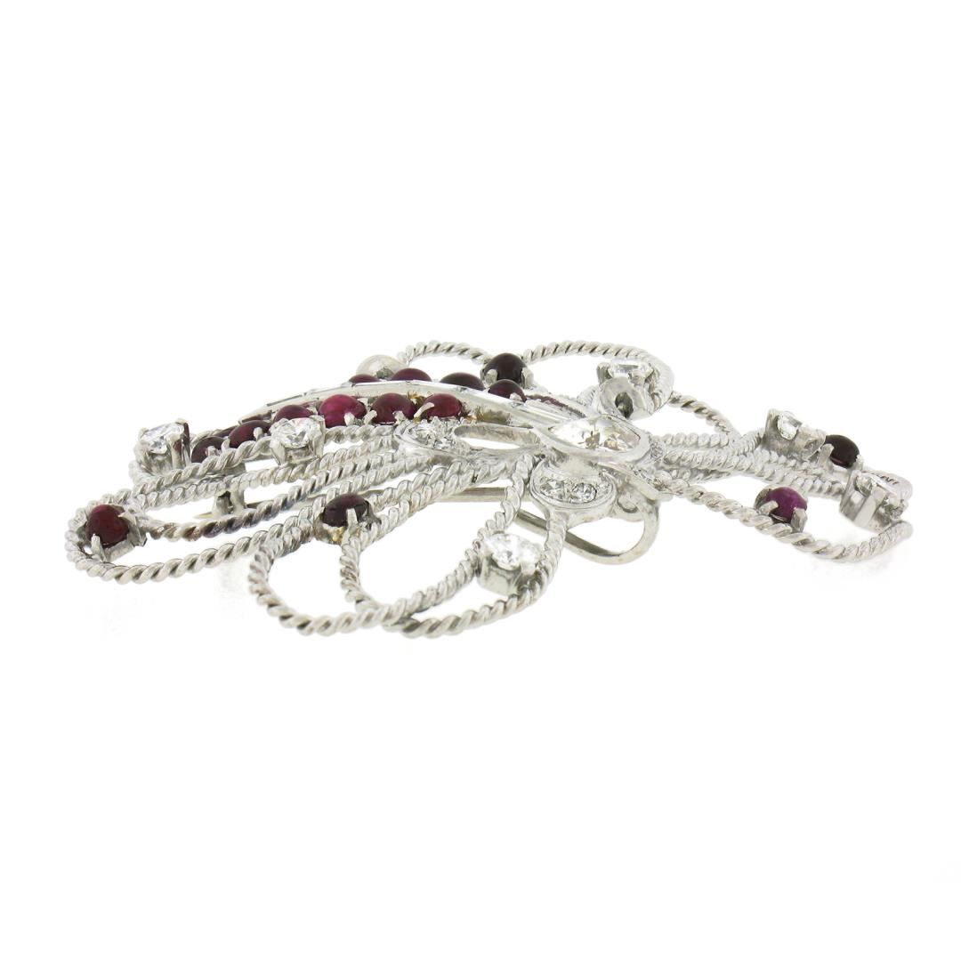 A vintage solid platinum brooch, with 18 round cabochon cut natural rubies (2.30ctw), and 30 old shield, old transitional, round brilliant, old single, old european & baguette cut natural diamonds (G/H - VS1-SI2 ; 2.45ctw). Measures 40x61mm and weighs a total of 19.11 grams.