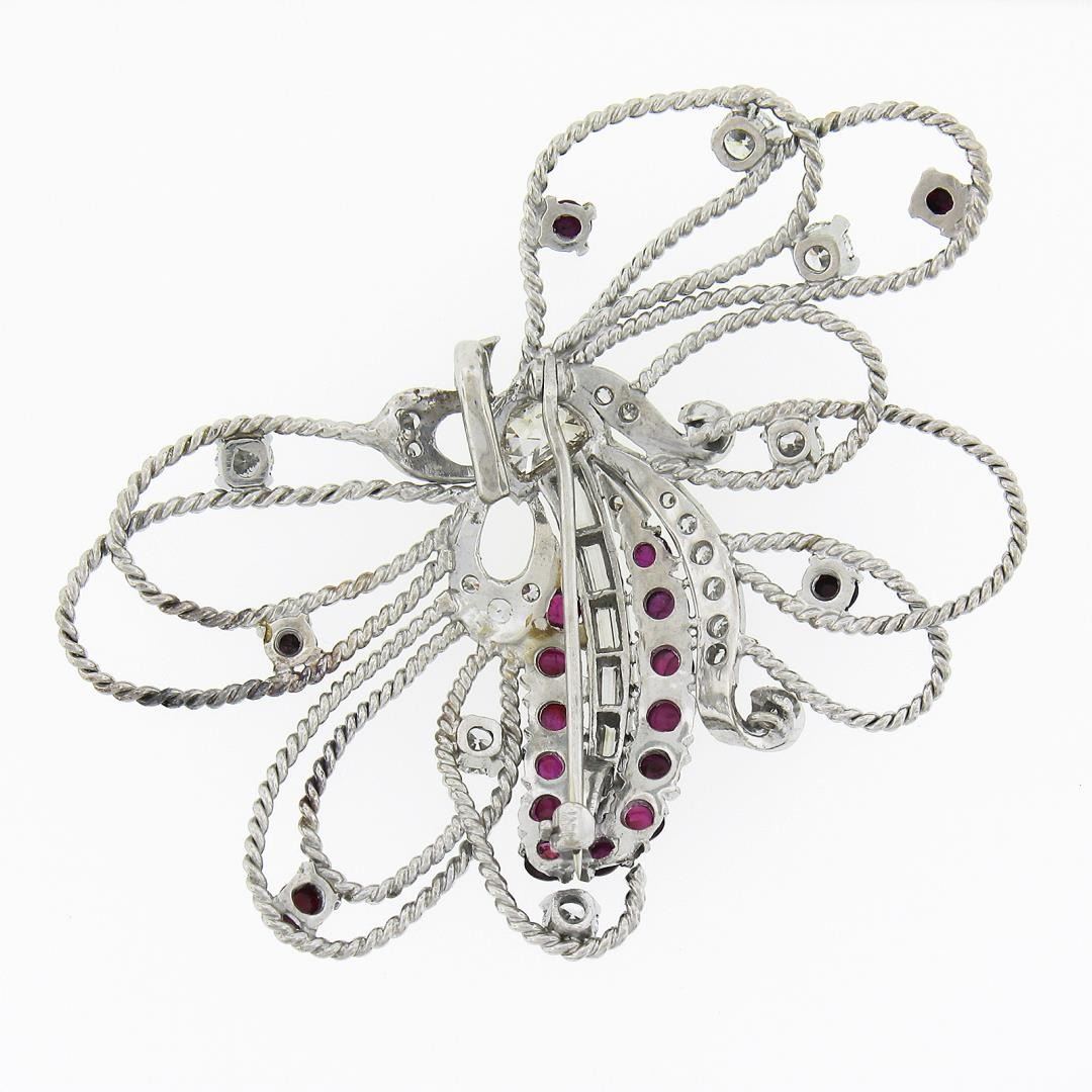 A vintage solid platinum brooch, with 18 round cabochon cut natural rubies (2.30ctw), and 30 old shield, old transitional, round brilliant, old single, old european & baguette cut natural diamonds (G/H - VS1-SI2 ; 2.45ctw). Measures 40x61mm and weighs a total of 19.11 grams.