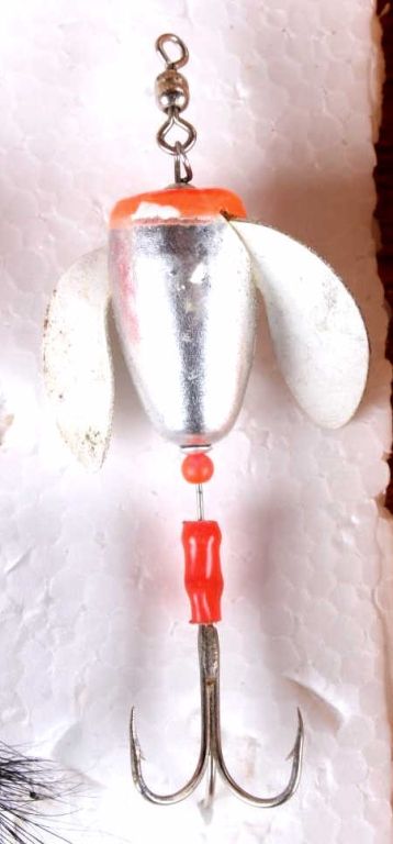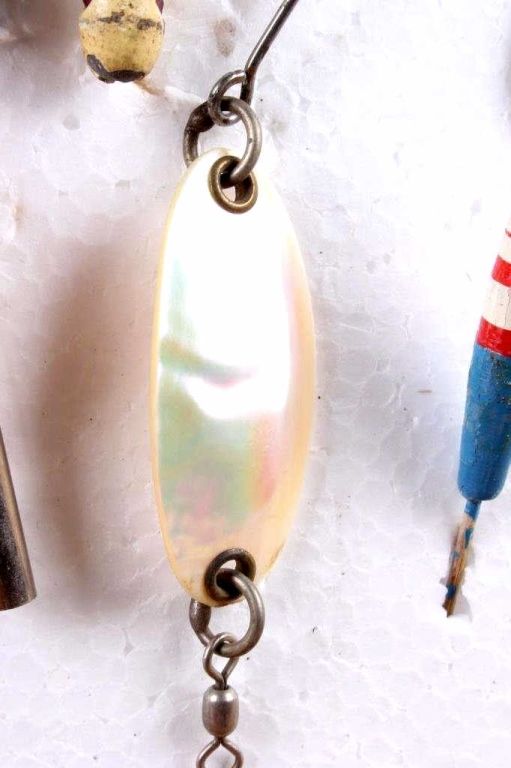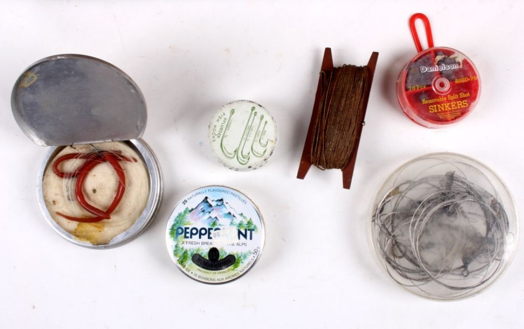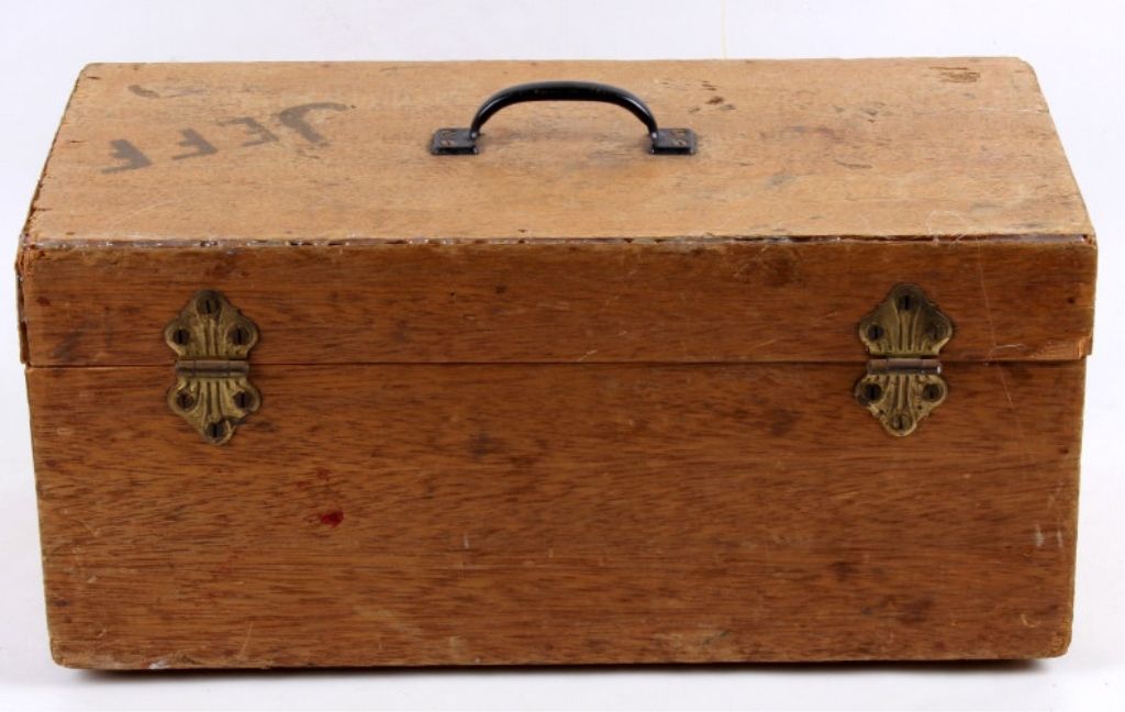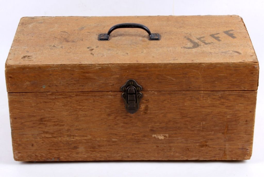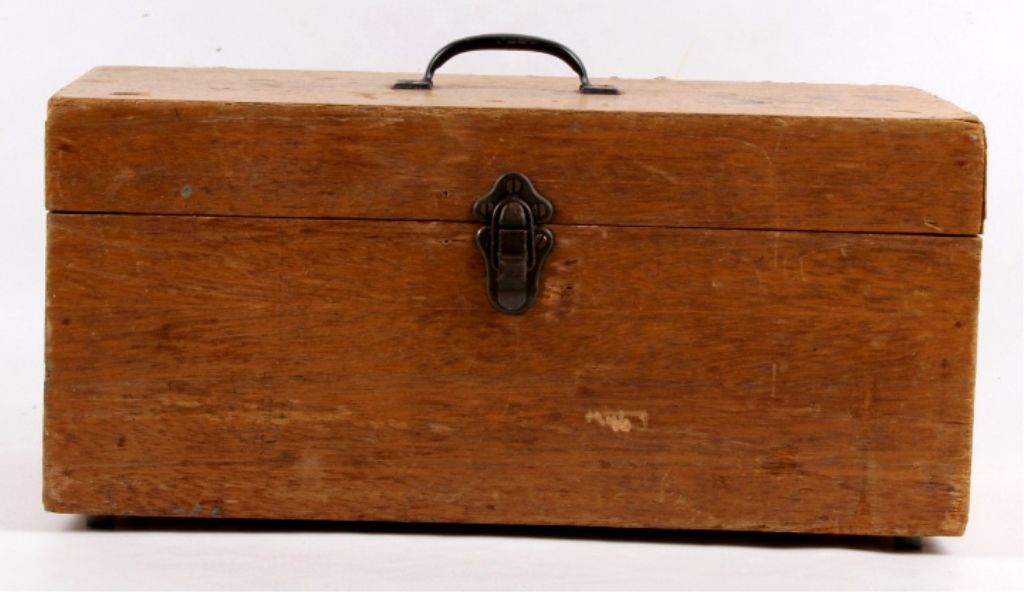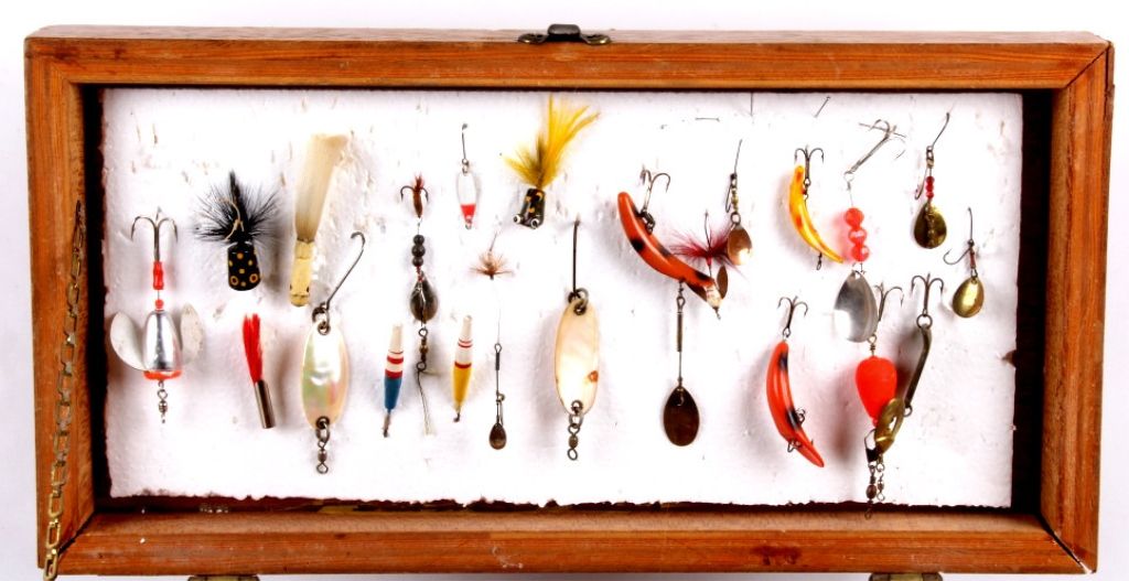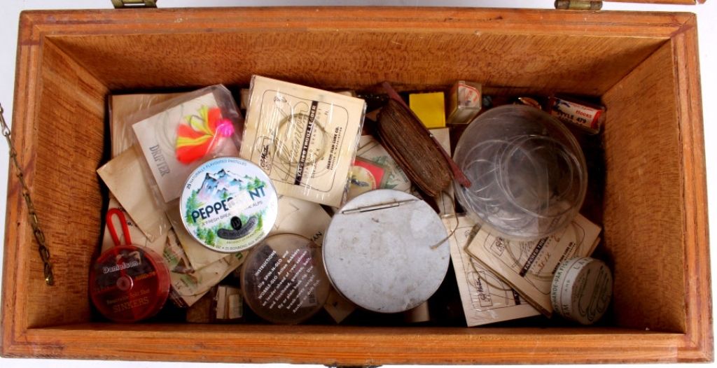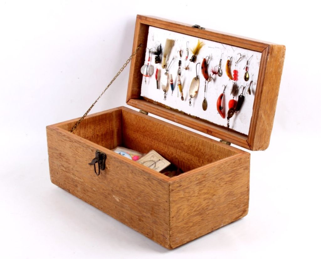 This tackle box is a custom handmade piece with many fishing supplies included. Made of solid wood. The tackle box includes fishing gear from tackle to line and weights. Measures 8.75"x18"x9".