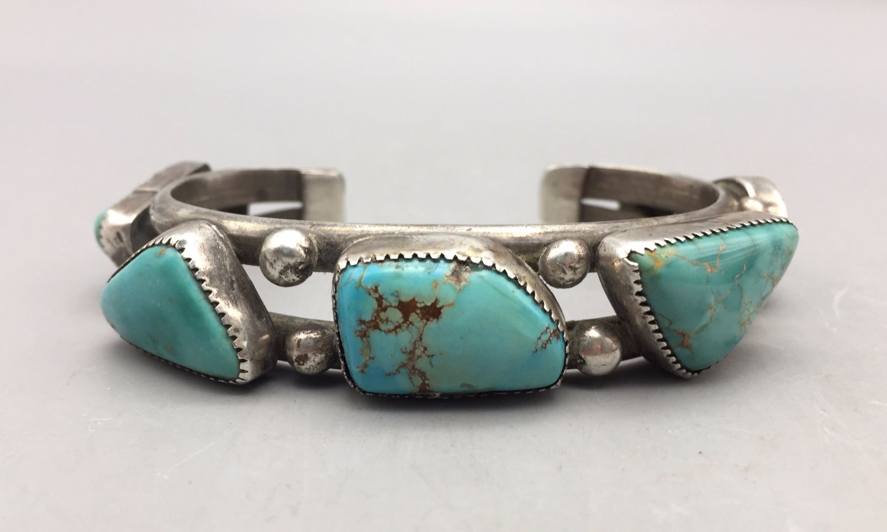 Description: Vintage, handmade, sterlings silver bracelet featuring five older turquoise cabochons that are set in handmade bezels. Maker: No hallmark, unknown. Approx. Age: Circa mid-century. Size: Measures 5-7/8” with a 1-1/8” opening (fits a 7” wrist). Weighs 65.4 grams. Condition: Good for its age, normal wear expected. Please look closely at the pictures - they are an important part of our description. Shipping: There will be a $5 handling / packaging fee for shipping this lot. The actual cost of postage will be added on top of that.