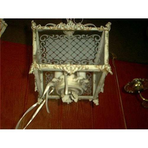 Ceiling Light Fixture is white metal and holds 4 candle light bulbs. The glass is in good condition, a little rust on the white. I have no way of knowing if the light works because it would have to be rewired. Measures 8 x 9 inches.