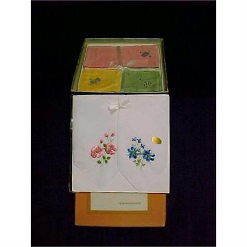Vintage Hankerchief Set of 5 - Beautiful assortment! Two floral patterns on white - one pink, the other blue - all cotton and Made in Switzerland. Three others are 'All Pure Linen, Made in USA' and accented with beautiful embroidery on backgrounds of yellow, green and pink linen. All are new and appear to be in original boxes.