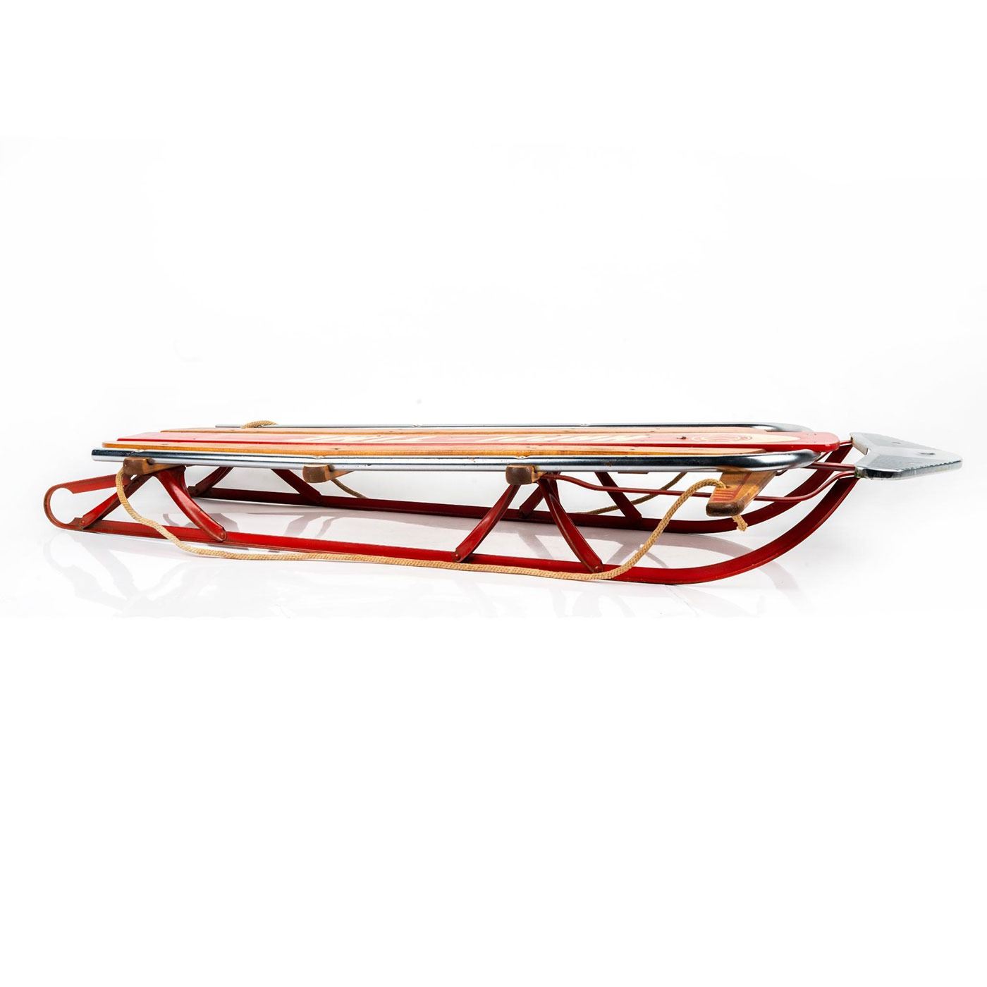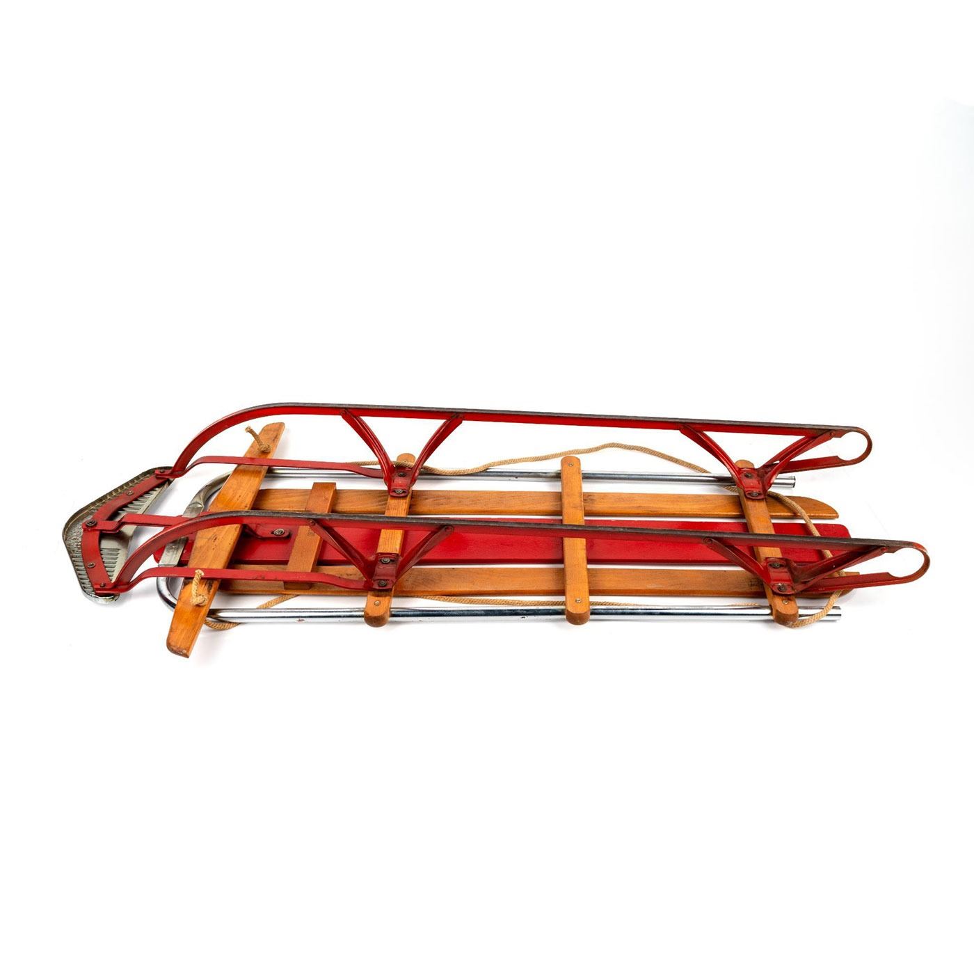 1950s sled that sports the Happi Time logo. Wooden body w. chrome hardware and red steel runners. Includes rope. Age and use related wear. Vintage Toys and Hobbies