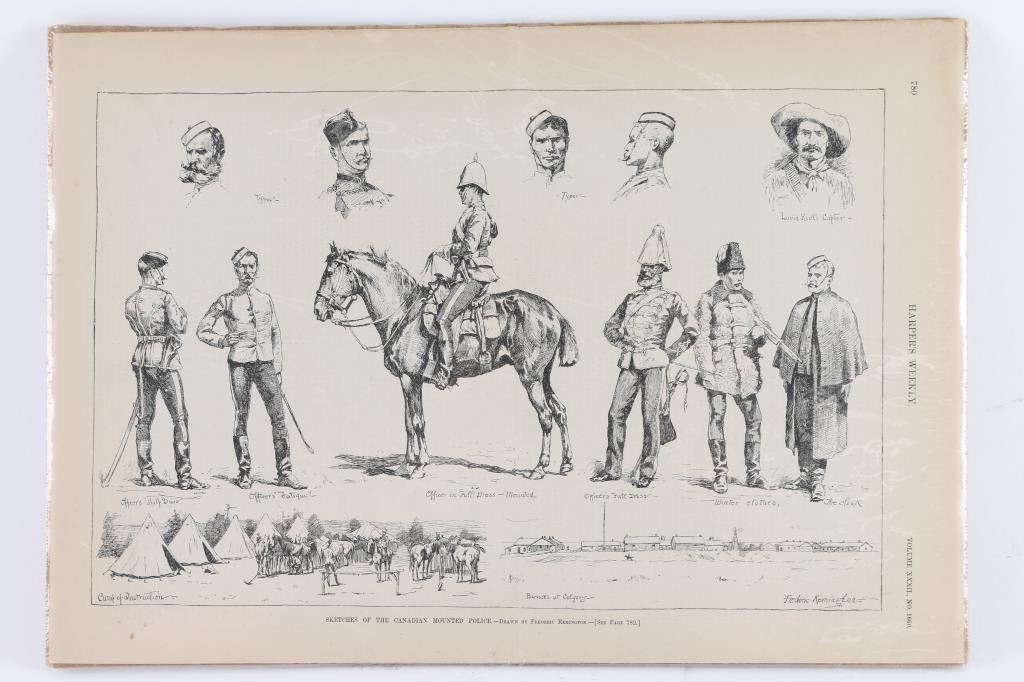 1888 Harper's Weekly, No. 1660, page depicting sketches of the Canadian Mounties drawn by Frederic Remington. Part of Joe Musso Collection. Good condition.