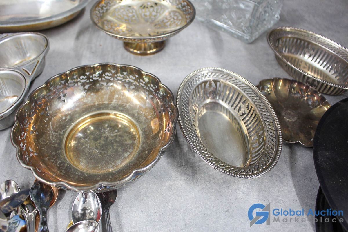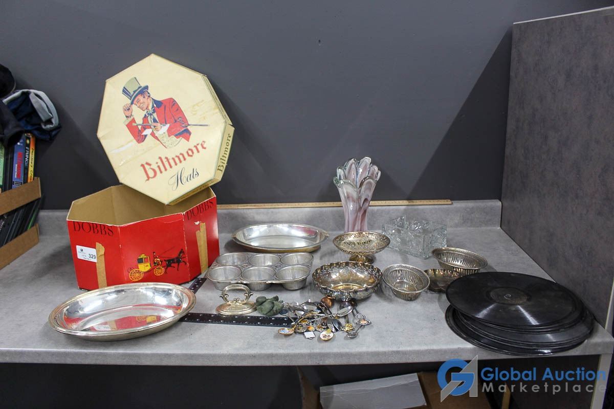 Vintage Hat Box w/Silver, Glass, Records & Collector Spoons