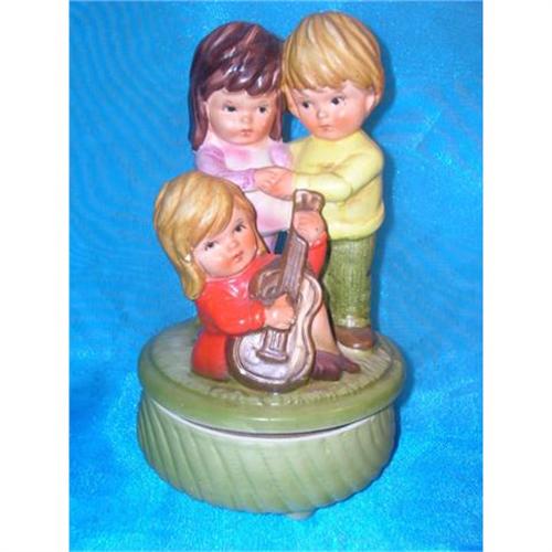 Description: Delightfully Charming Figural Representation of a Trio of Young Children (2 Girls and a Boy) - One of the Girls is Dancing with the Boy, as the Other Little Girl Strums the Joyful Tune of "Havanagila" on her Guitar