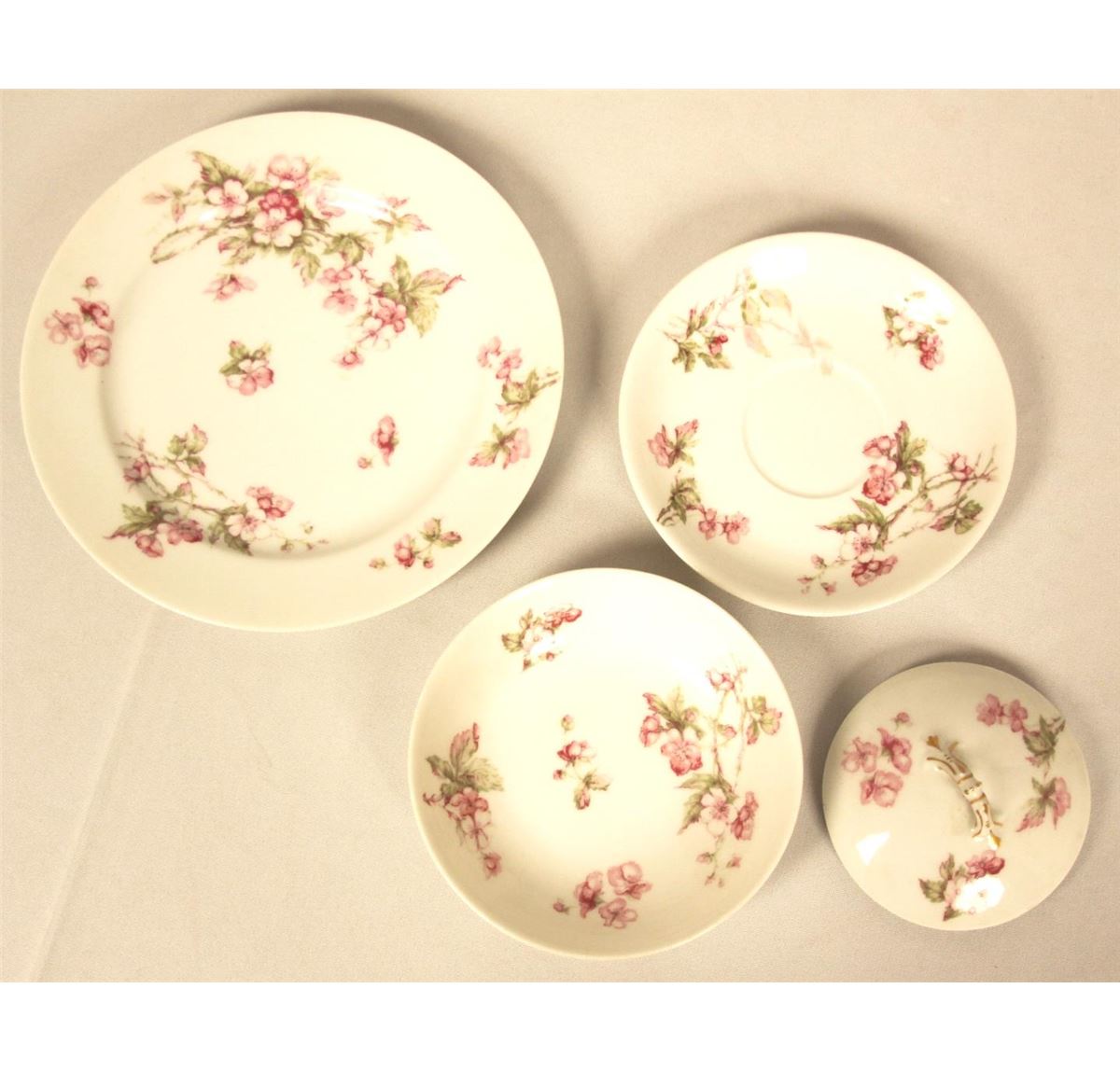 This is a vintage lot of 10 pieces of Limoges by Havilland & Co. It is white with pink flowers. Pattern is Schleiger 241C. This lot consists of 3 lunch plates (7.5"), 5 saucers (5.5"), 1 fruit/berry bowl (5"), 1 sugar lid (3.5"). No chips, cracks or repairs. Valued between $200-$250.00.