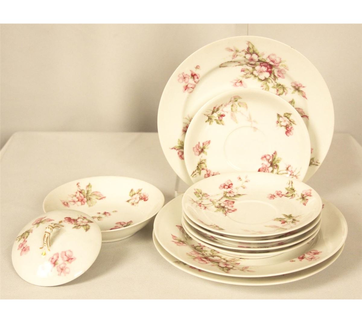 This is a vintage lot of 10 pieces of Limoges by Havilland & Co. It is white with pink flowers. Pattern is Schleiger 241C. This lot consists of 3 lunch plates (7.5"), 5 saucers (5.5"), 1 fruit/berry bowl (5"), 1 sugar lid (3.5"). No chips, cracks or repairs. Valued between $200-$250.00.