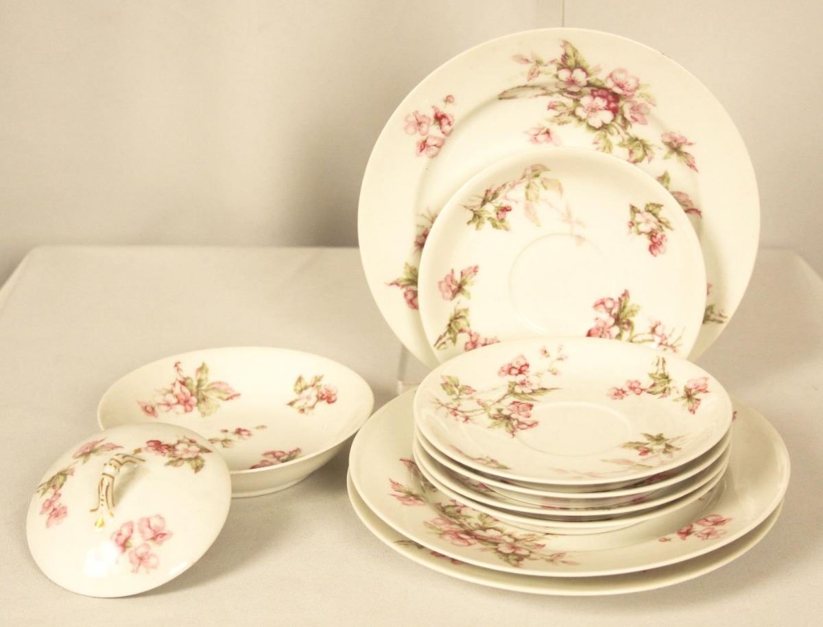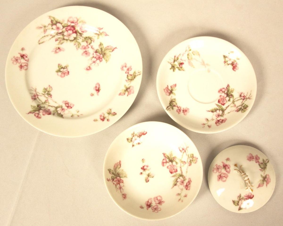 This is a vintage lot of 10 pieces of Limoges by Havilland & Co. It is white with pink flowers. Pattern is Schleiger 241C. This lot consists of 3 lunch plates (7.5"), 5 saucers (5.5"), 1 fruit/berry bowl (5"), 1 sugar lid (3.5"). No chips, cracks or repairs. Valued between $200-$250.00.