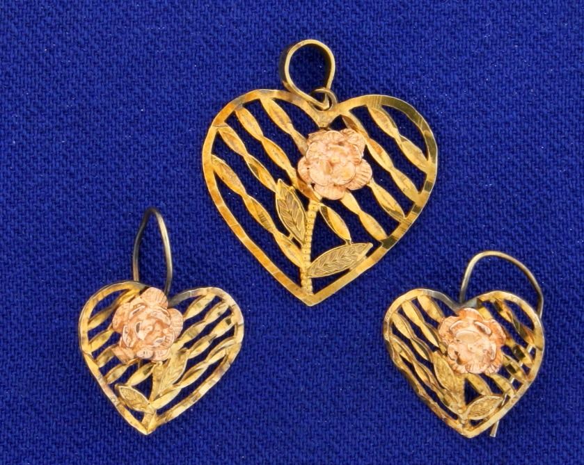 In 10k yellow and rose gold. Pendant is 3/4" long with bale. Earrings are 3/8 inch long each. 1.7g.