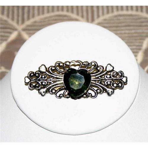This is a wonderful vintage stamped gold-tone metal Brooch or Pin done in a Filigree heart motif with an antique-wash finish from the Victorian Revival Period 1940s. In the center of the Pin sits a very large, dark Emerald Green Heart shaped Glass stone prong set and revived to the Brooch plate. Overall measurements of this darling Brooch are 2 1/2 inches wide by 1 inch long.