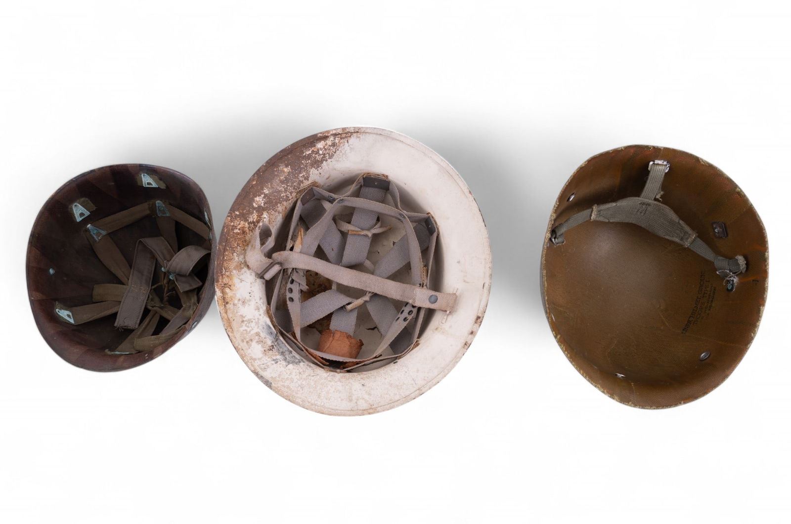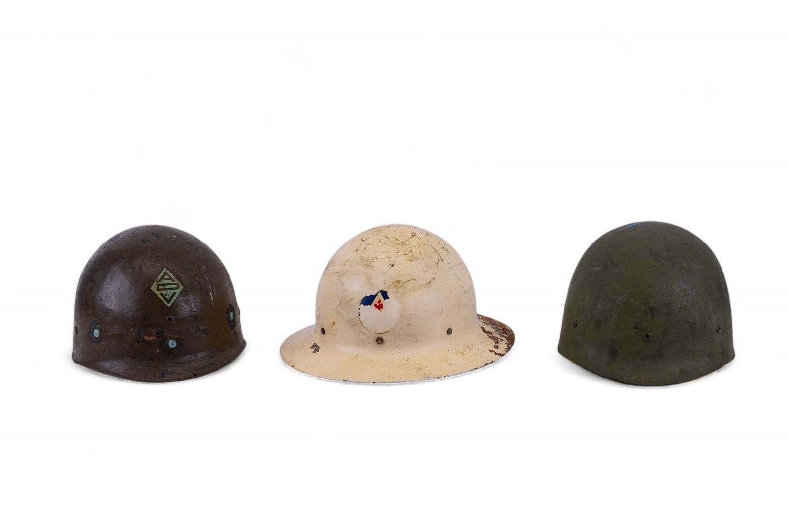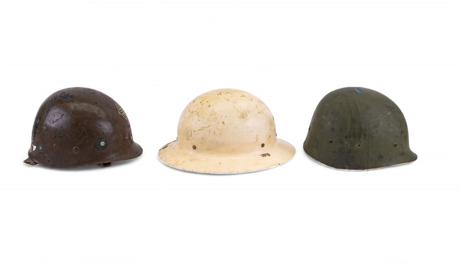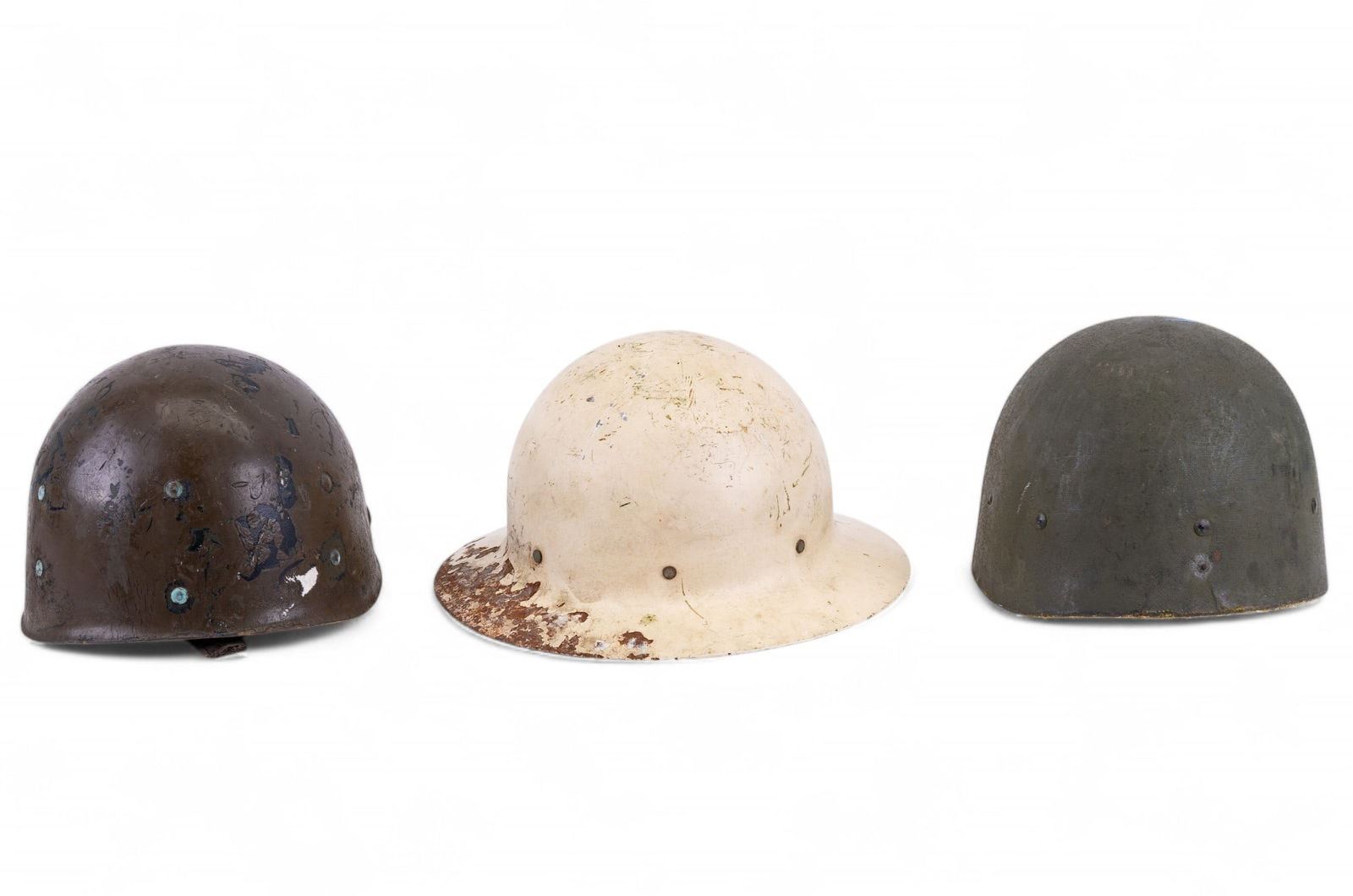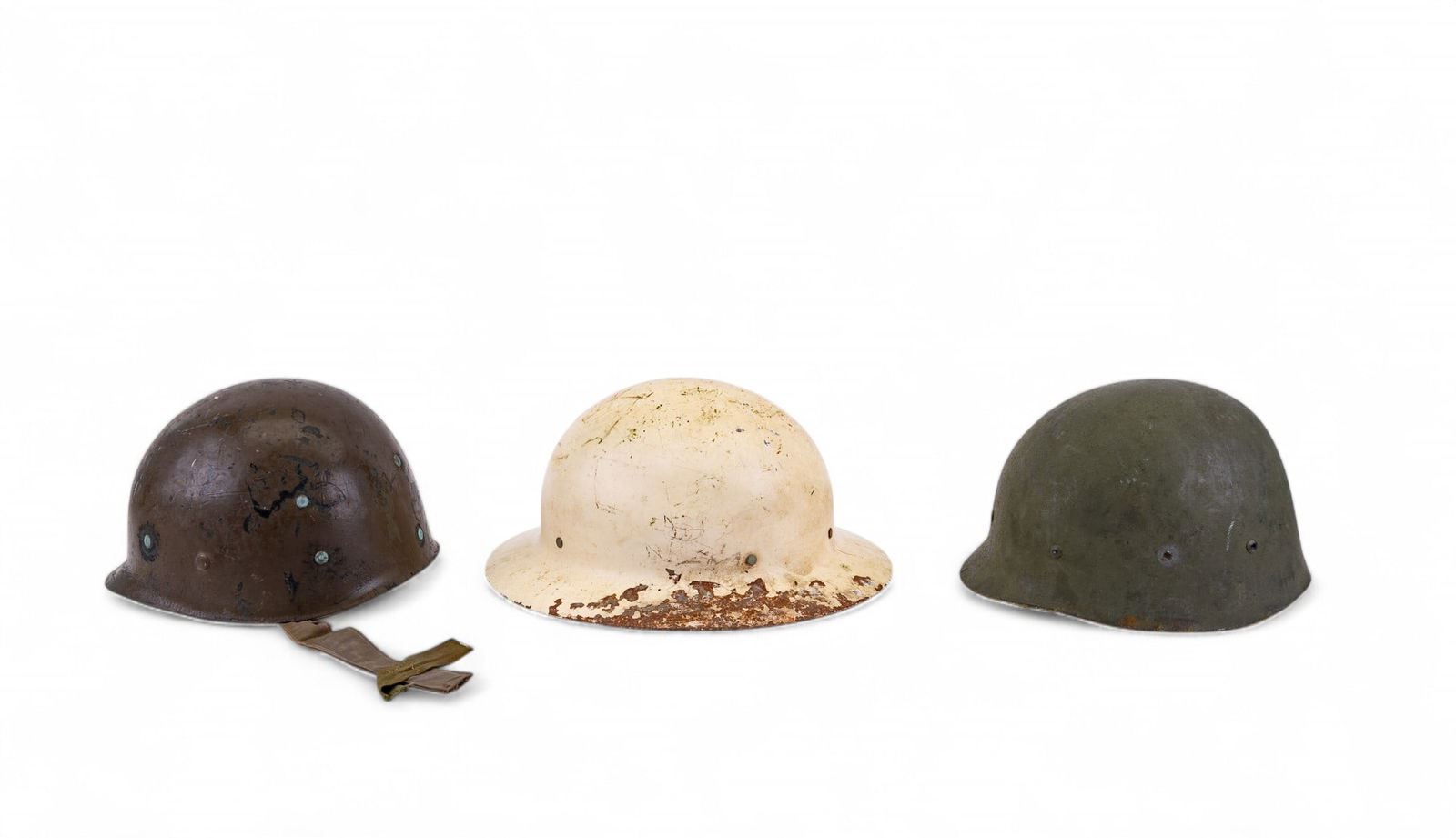 Vintage WWII era white metal civil defense helmet, vintage M1 helmet, used by US Military from WWII to the 1980s, and a reproduction combat helmet.