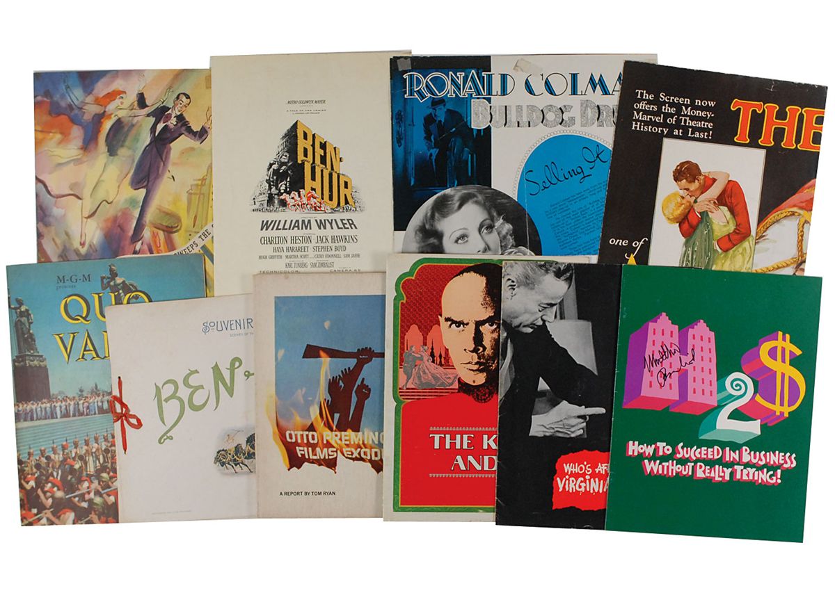Ten programs and flyers from various films and stage productions, dating from between 1905 and 1995. Included are items from Ben Hur (1905), The Merry Widow (1925), Bulldog Drummond Strikes Back (1934), Swing Time featuring Fred Astaire and Ginger Rogers (1936), Quo Vadis (1952), the Ben Hur roadshow (1959), Exodus (1960), Who’s Afraid of Virginia Woolf? (1963), The King and I (1978), and How to Succeed in Business Without Really Trying, signed on the front cover in black felt tip by Matthew Broderick (1995). In overall very good condition.